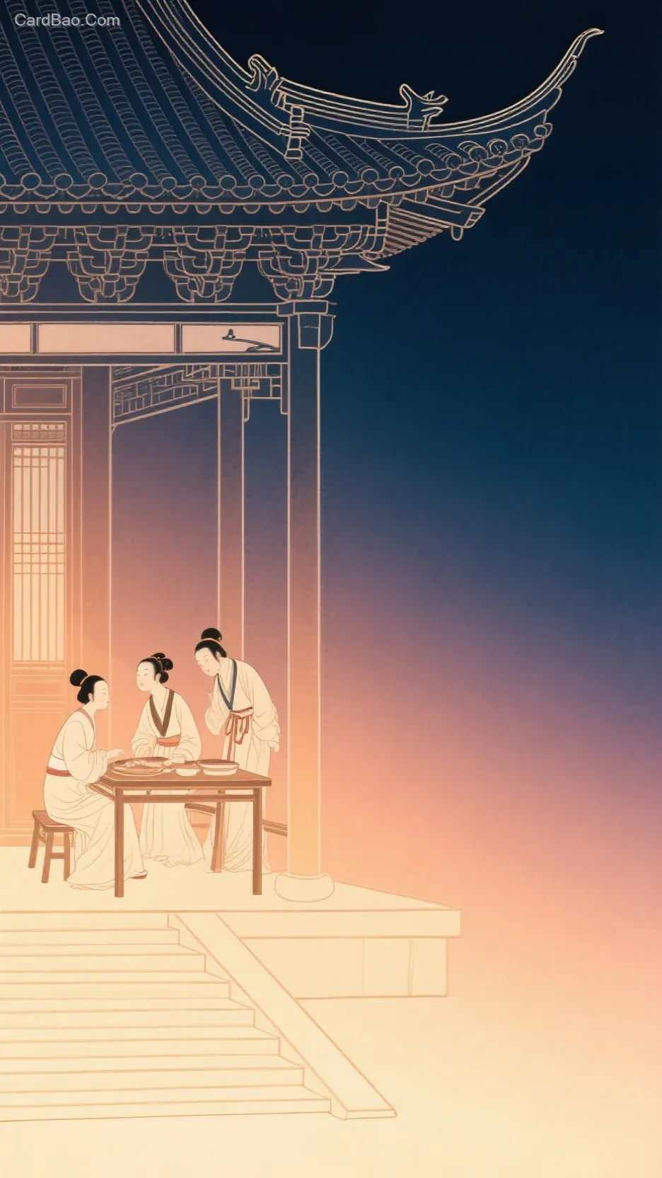 A gradient-toned realistic line drawing, precisely depicting Song Dynasty architecture and daily life scenes of Song Dynasty figures, with a strong composition of contrasting gradient hues and contour lighting.