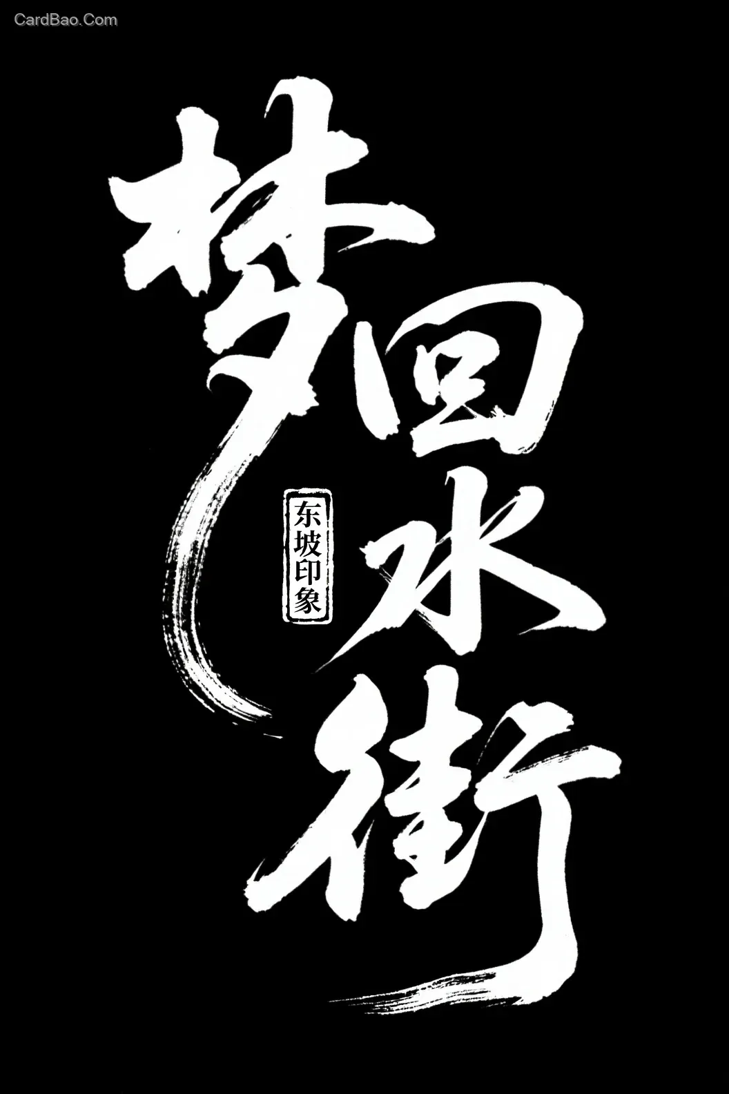Black background with white text, "Dreaming Back to Water Street" artistic font design, requiring a brush hand-written style with a highly artistic writing approach. Visually striking, with strokes enhanced by ink wash brush effects, cleverly extended and stylized in design, accompanied by a small seal "Dongpo Impression" on the side.