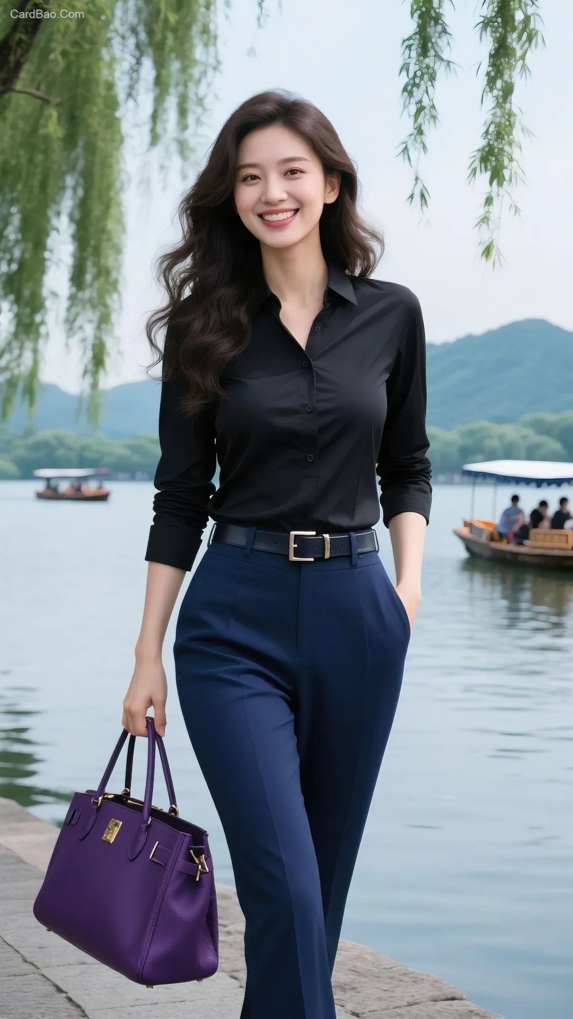 一位长发披肩微卷的美女,穿着黑色紧身衬衫,深蓝色紧身西裤,有皮带,背景是垂柳、湖水、远处的青山以及船上的游人 。左手挎着深紫色手提包,面带微笑。