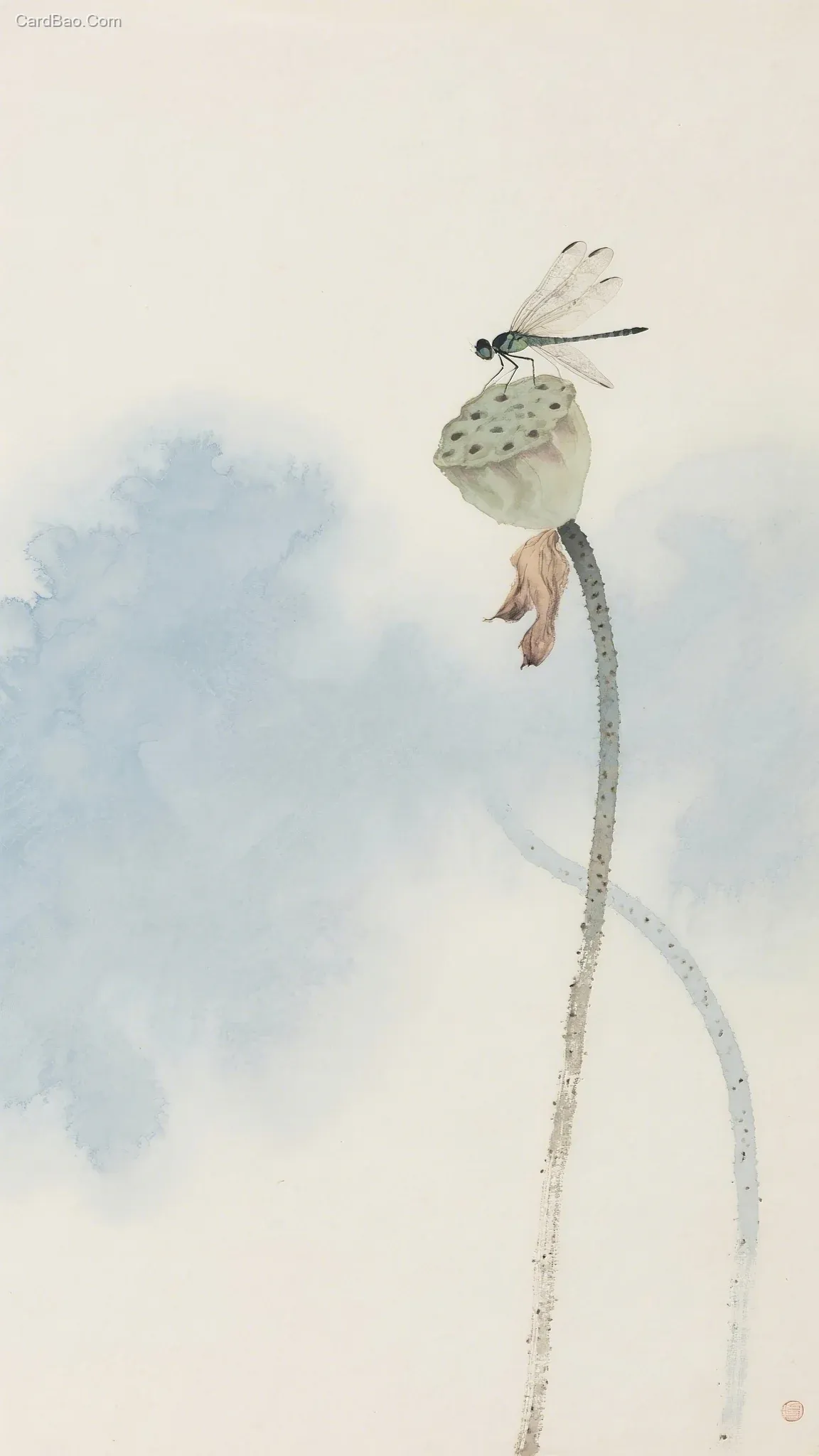 淡雅色调调和,朦胧晕染氛围,柔和色彩晕染,纸本设色,淡蓝,米色纸张上的晕染画,渐变,自然过渡,柔和,大写意,极简主义,颗粒感, 水彩画风格,大面积晕染,写意,晕染,雾气,浓雾,流体,一枝荷花花凋落,一只蜻蜓落在荷花上,意境,禅意!