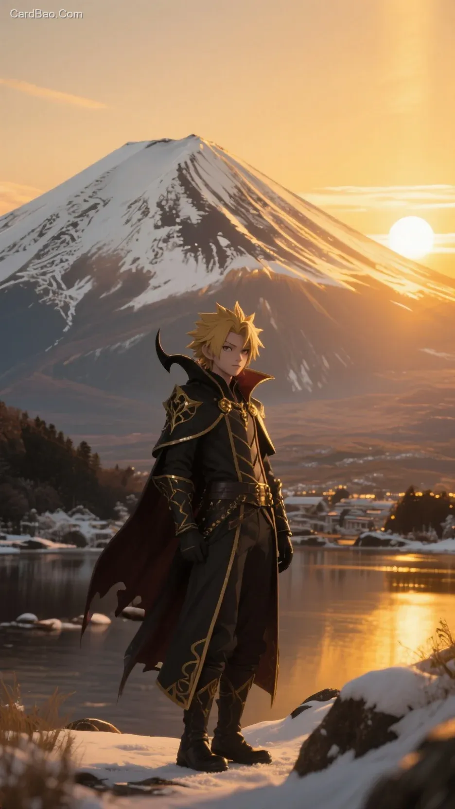 在暖色调光影下,魔男的伊奇站立在被日落余晖映照的富士山旁。富士山上覆盖着雪白的积雪,在暖光的照耀下泛出银黄的色泽,仿佛有金字在熠熠发光