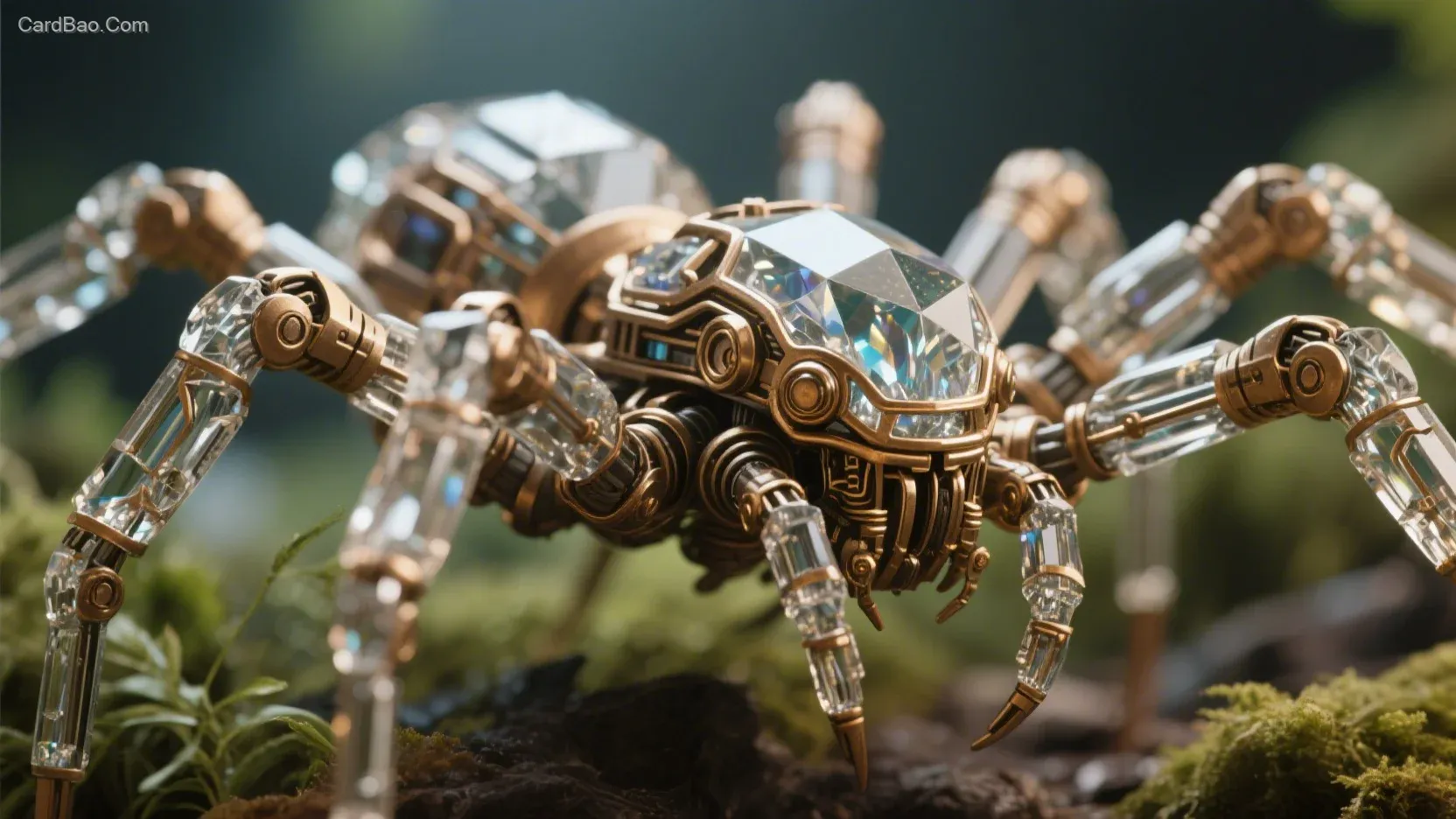 A mechanical spider composed of intricate bronze-colored metal components and crystal, set against a natural environment background. Presented in 8K ultra-high definition to showcase rich micro-details, with a cinematic scene atmosphere.