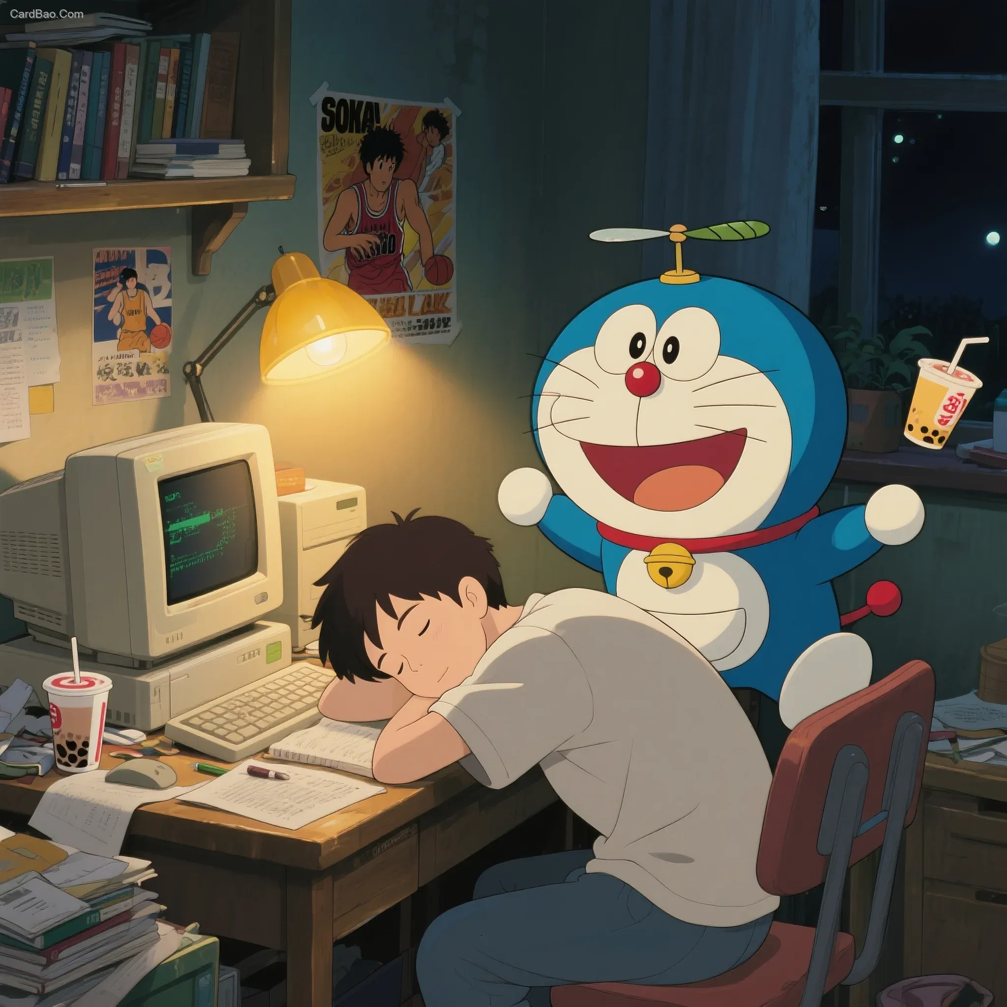 Healing-style illustration, a messy 1990s desk at night (old computer/Slam Dunk poster/instant milk tea), an exhausted post-90s person taking a nap on the desk, a giant Doraemon wearing a bamboo-copter happily playing nearby, warm yellow desk lamp light, Hayao Miyazaki mixed with realistic style, soft focus warm lighting, 8K