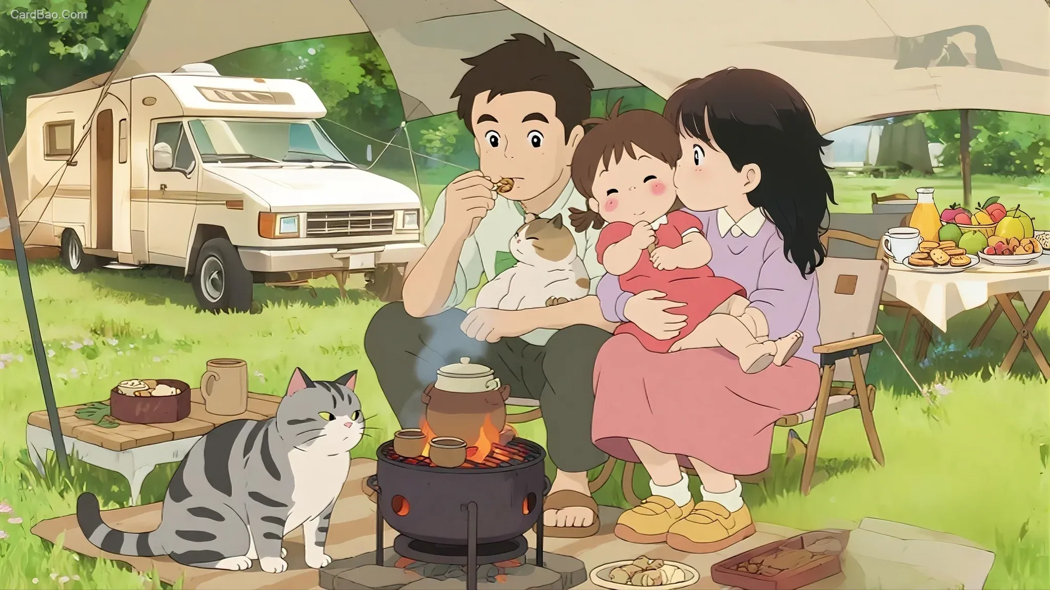 大家一起在草地上露营,有帐篷桌椅板凳,开心的露营画面。