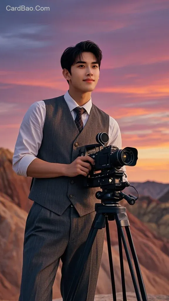 ##一位身穿高定西服马甲领带三件套套装的整齐发型帅哥,站在夕阳残照彩霞满天的丹霞地貌的背景前,双手抱三脚架上专业广播摄像机,正面半身照,人物摄影z,大气壮观,超高清画质清晰逼真,大师级构图。比例 3:4。