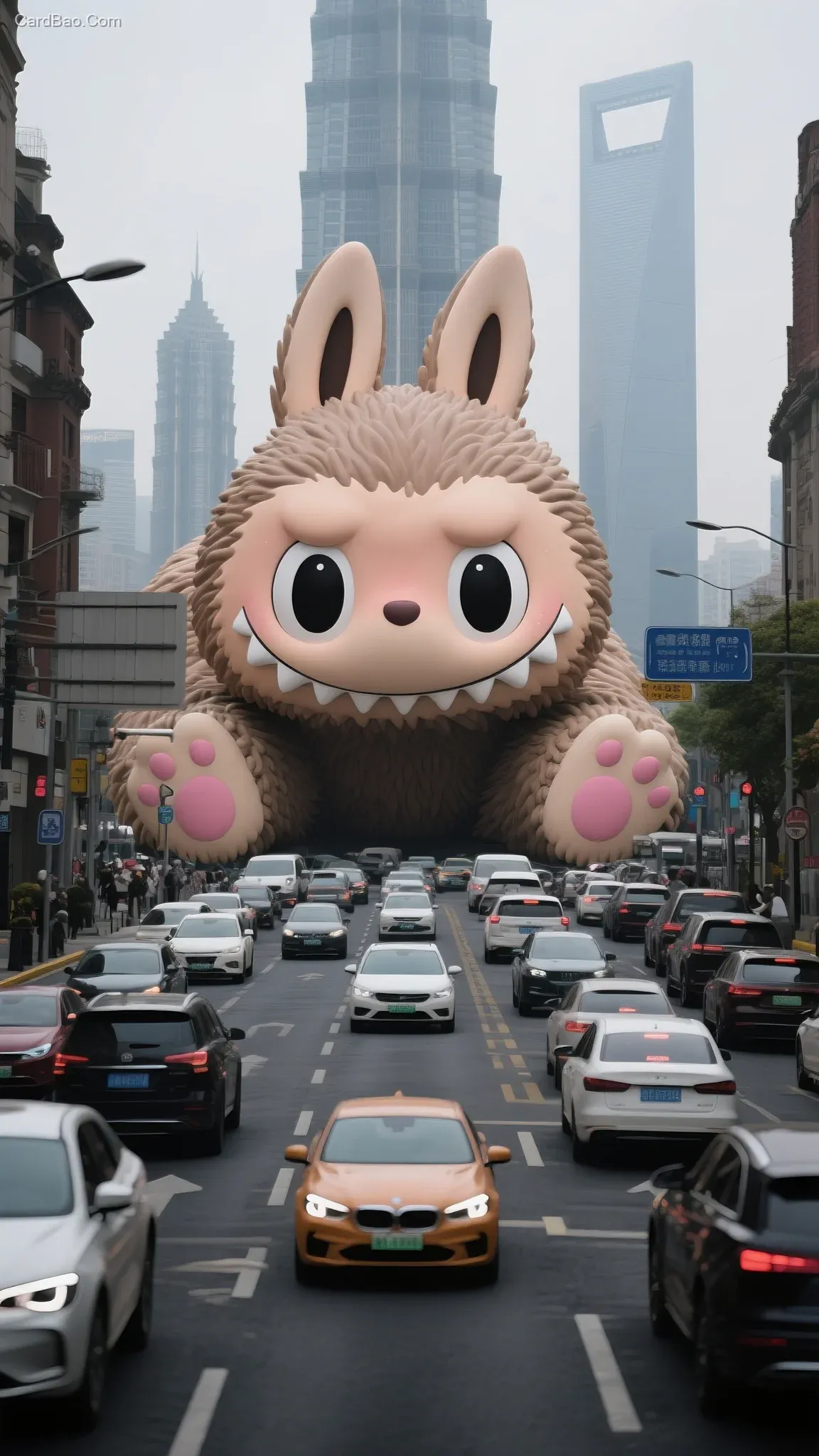 A giant Labubu, Pop Mart, cartoon style, anthropomorphic character, rabbit ears, light brown fur, large eyes, black pupils, sharp teeth, pink cheeks, lying on the streets of Shanghai, Lujiazui, small cars, it is as tall as the buildings, as wide as the road, blocking the street, with many vehicles coming and going on the road. Surrealism, cinematic texture, surreal feeling. The overall tone is sophisticated, high-end grayscale, hazy light, illusory and mysterious.