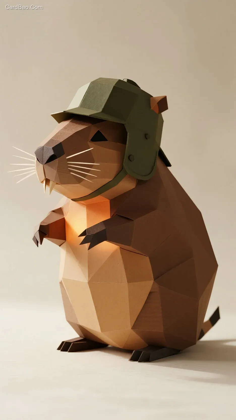 立体折纸艺术作品,呈现卡皮巴拉形象。用纹理纸张,通过折叠塑造军盔、和毛发与动态姿势,内部嵌入暖光源,让光线透过纸张缝隙,营造光影层次,背景为简洁浅色调,突出折纸水豚的艺术感 。