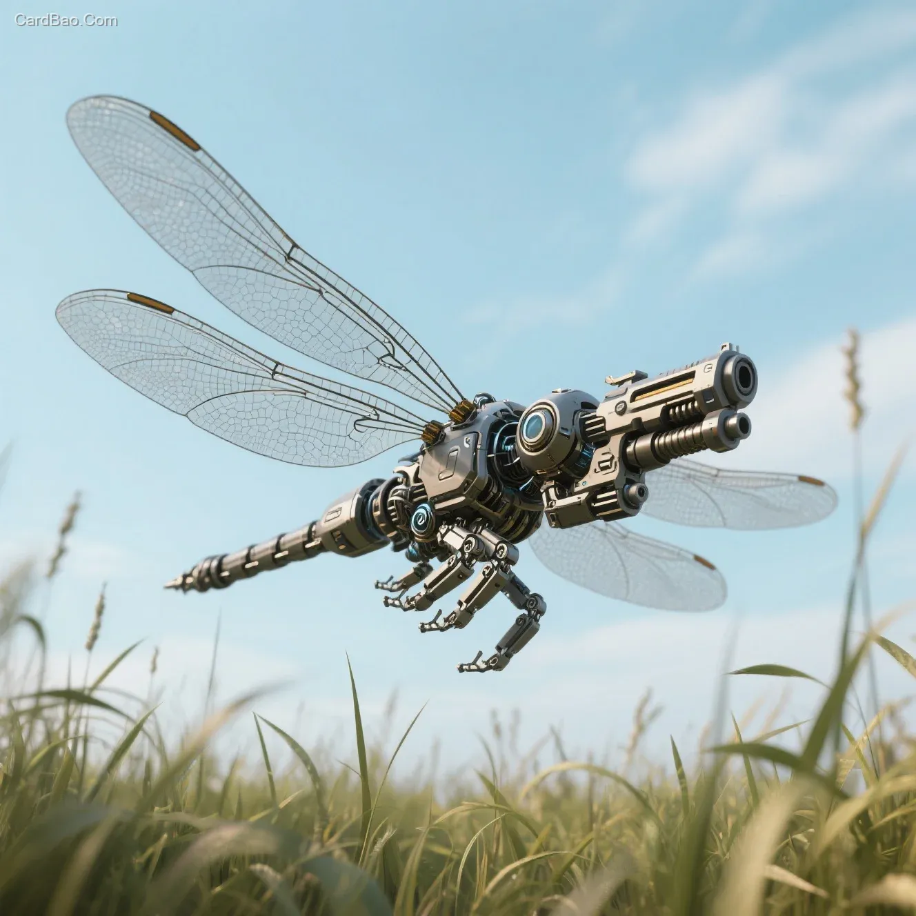 A mechanical dragonfly flies over the grass, emphasizing mechanical aesthetics, with intricate detailing and textures, equipped with heavy weaponry, in 3D form, highlighting precision and a sense of advanced technology.