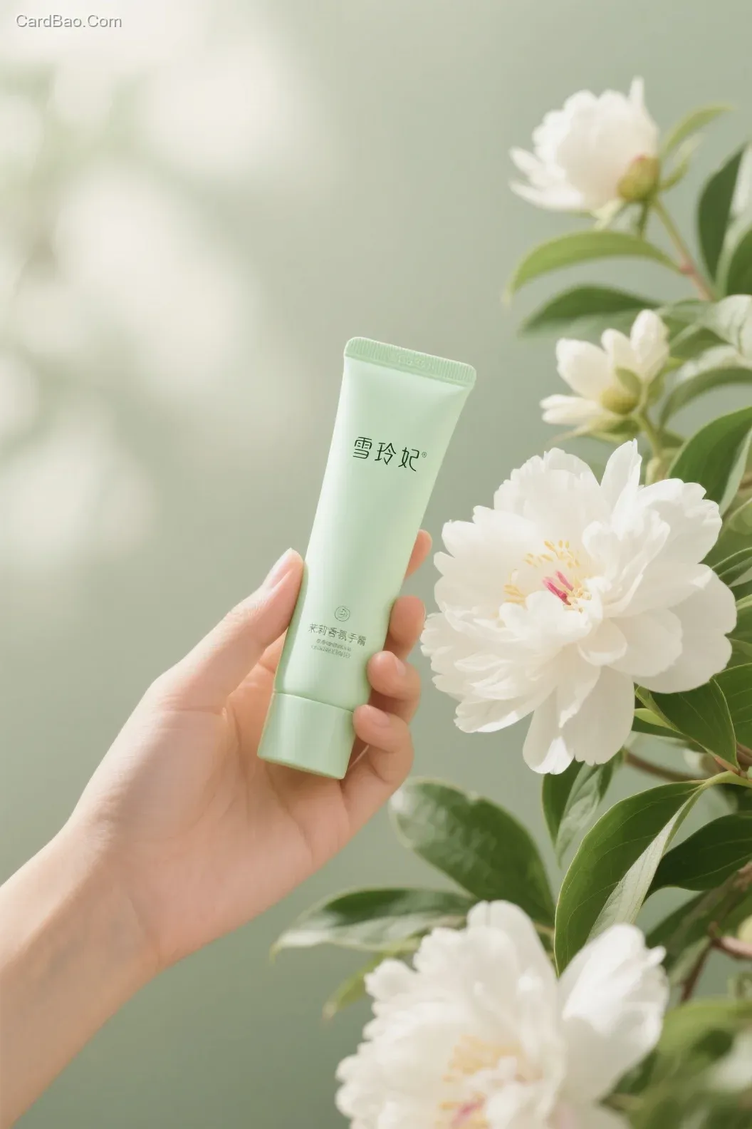 Under the soft and dreamy interplay of light and shadow, a hand gently cradles the Snow Lingfei jasmine-scented hand cream, its pale green tube exuding simplicity and elegance. Beside it, pristine white flowers bloom freely, accented by verdant leaves. The background is hazy and gentle, as if bathed in a delicate glow. The scene conveys a refreshing and natural ambiance, evoking the romance of peony blossom season and the soothing, delightful essence of the hand cream infused with aromatic botanical oils.