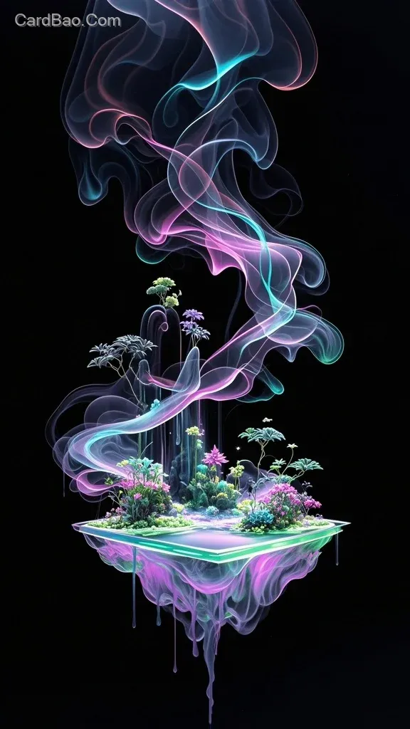 水墨画,由霓虹烟雾形成的空中花园,透明,近距离,正面特写,线条像水流般柔和自然悠长,意识流,极简,水墨意境,烟雾质感,梦幻,超现实主义,3D,唯美,拖影,拉丝,禅意,空灵,抽象,背景纯黑,强烈的色彩对比,128k分辨率
