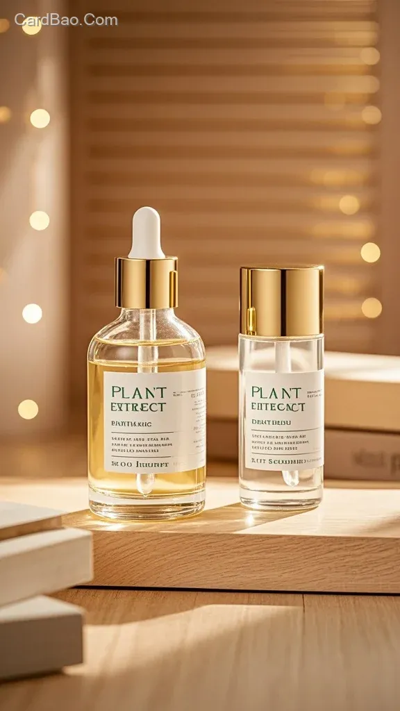 商业拍摄,展示两瓶护肤品,瓶子的设计简洁而现代,带有金色的滴管盖子。瓶子上标有“PLANT EXTRACT”的字样,表明它们可能是植物提取物制成的产品。背景是一个温暖色调的环境,使用了木质装饰元素,营造出一种自然和谐的感觉。这种风格通常用于高端护肤品牌的广告宣传,强调产品的天然成分和高品质。