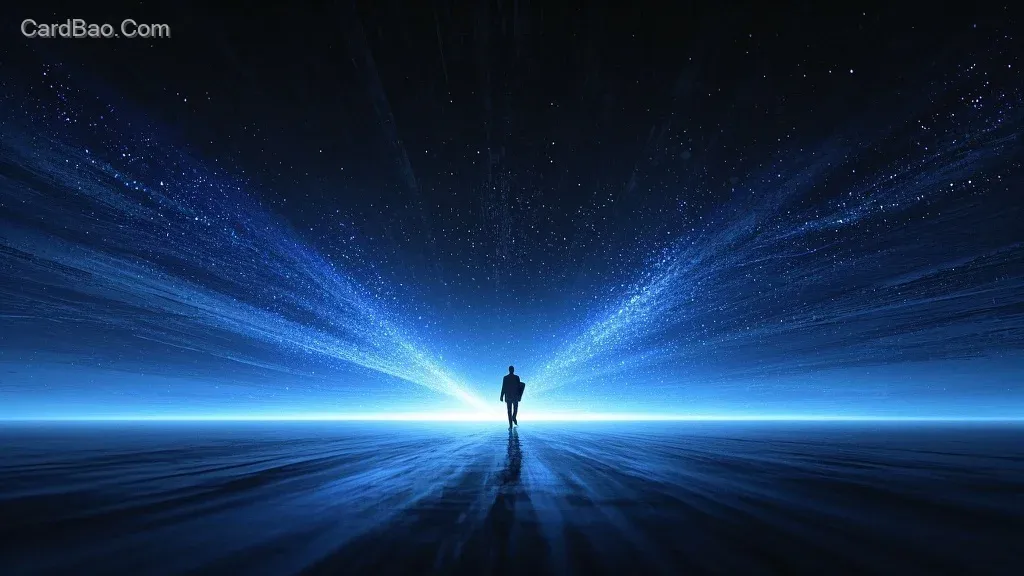 无境空间,存在法则,空洞,深黑蓝色,简约,干净画面,平滑,复古胶片,微小人物,抽象,磨砂,走进,光景,虚拟,粒子,漂浮,极简主义,干净的画面,没有文字,极简主义,极致构图,完美构图,极致留白,大面积留白,肌理磨砂,电影海报,插画,东方美学,大量留白,原研哉的美学,索尔·巴斯的几何排版,奥利·莫斯的分层故事讲述,12K超细节,电影照明