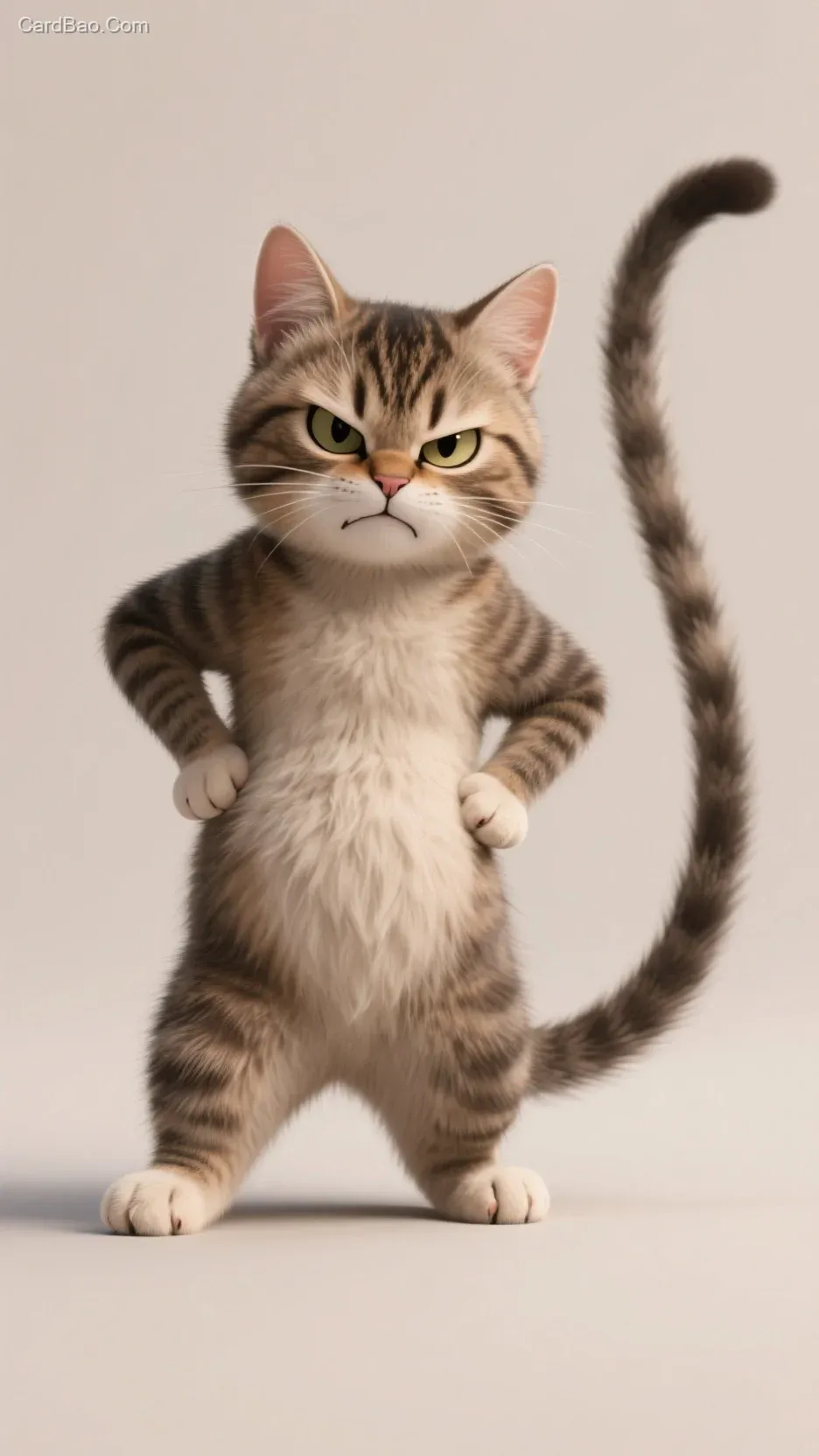 A CGI-rendered anthropomorphic kitten with a fluffy belly, standing on its hind legs with its front paws on its hips. It has an angry expression and a long tail. The image is striking, creative, and styled in a mythical manner, full of expressiveness. A masterpiece-level work with a solid-colored realistic background, rendered in 8K ultra-high definition.
