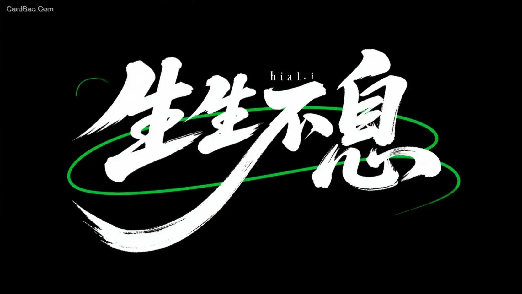 “生生不息”艺术字体设计,黑底白字,毛笔手写风格,极强的艺术写作风格。视觉震撼,笔画增加水墨笔刷效果,笔画巧妙延长设计变形,绿色点缀