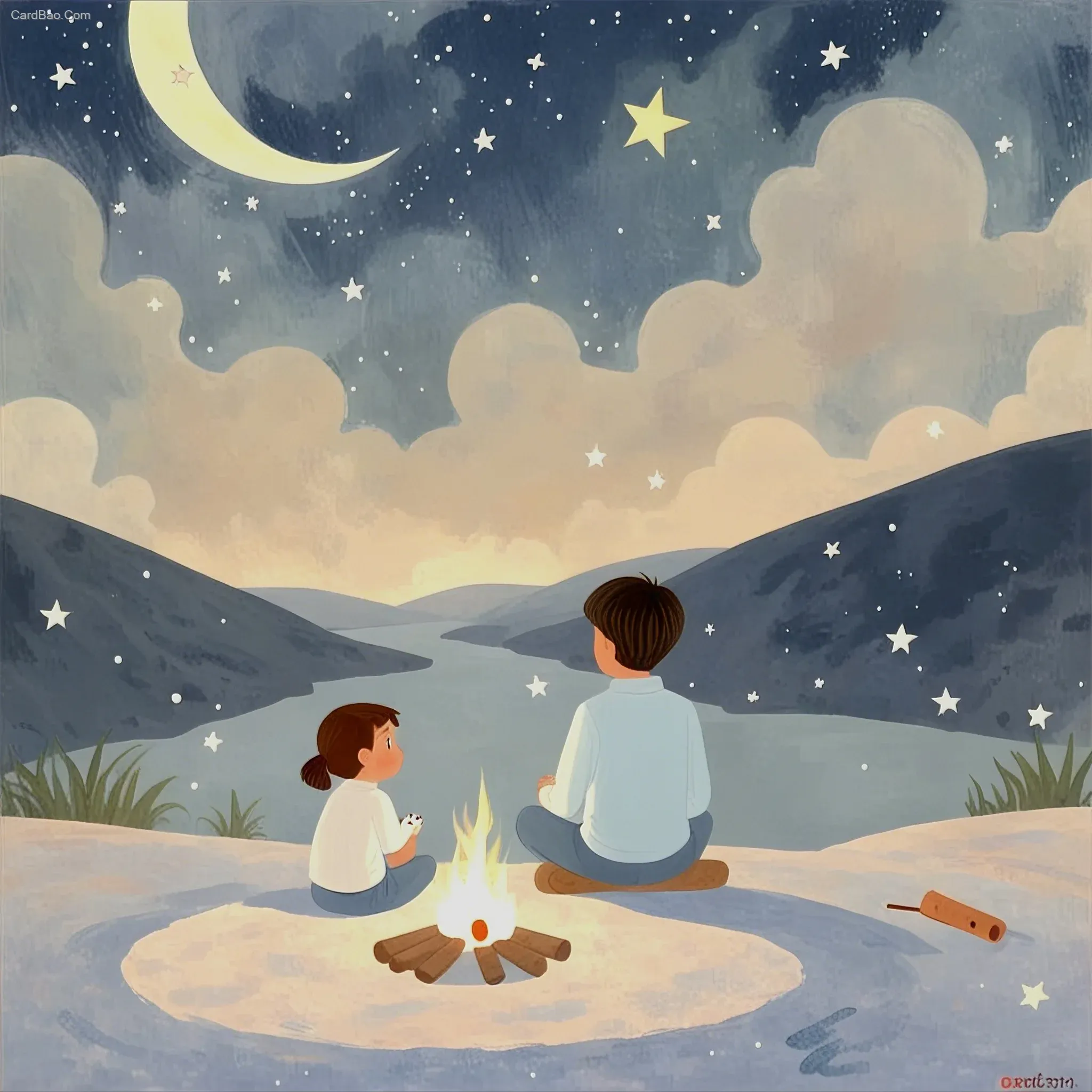 ##########淡蓝色背景,儿童绘本画风,画面大量留白,人物小,,人物背影,一个孩子坐在火堆旁边看星星,简洁,柔和,唯美,大师风格,简笔画