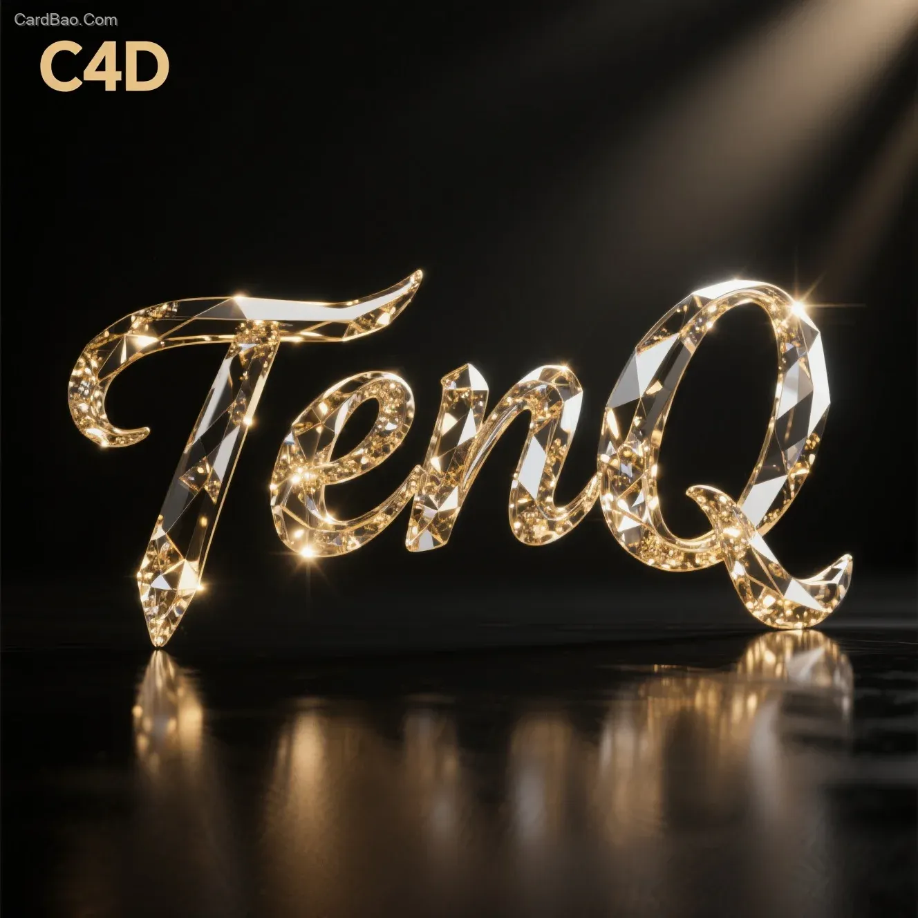 水晶质感文字与黑色背景:在C4D里创建 “TenQ” 文字,字体设计为灵动的手写花体,线条优美。文字模型呈现出璀璨的水晶质感,内部有细微的折射和光芒散射效果,仿佛由无数细小的晶体组成。黑色背景深邃神秘,与闪耀的水晶文字形成鲜明对比,突出文字的华丽与梦幻。
