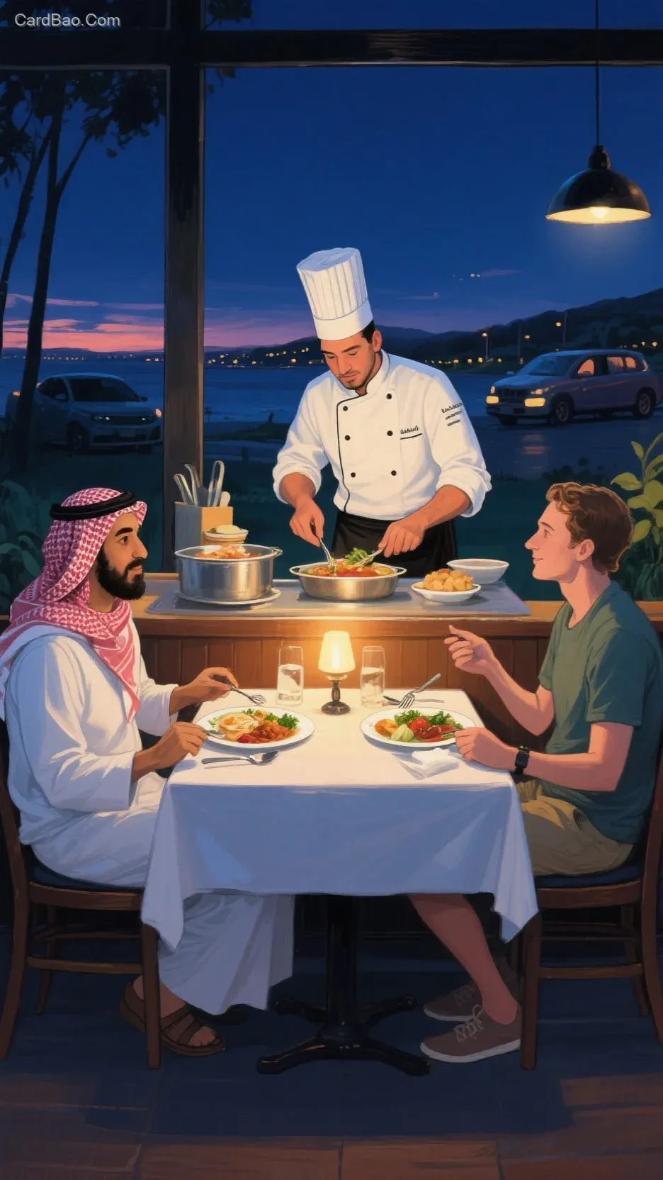 帮我画一幅图画,题目是开普列的强光收获开普利在餐馆里当一位厨师。那天晚上天已经不早了,来了两位不熟车客,因为是阿拉伯沙特阿拉伯来的,一位是澳大利亚的游客,他准备了两份晚餐。他们边吃边聊。