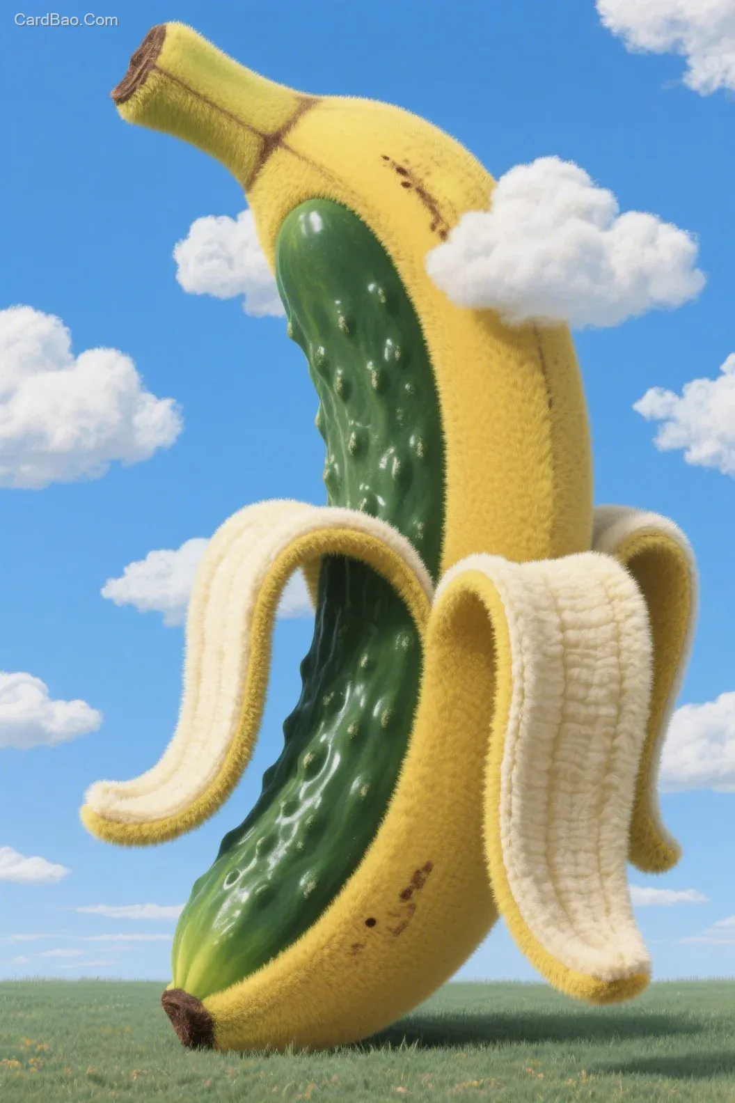马格里特风格毛绒超现实场景,巨大的香蕉与黄瓜结合用毛绒制作,毛绒表面光滑。蓝色的天空与白色的云朵是毛绒材质,奇特的组合带来超现实的氛围。神秘而引人深思,毛绒的柔软让画面多了一份奇幻的触感。