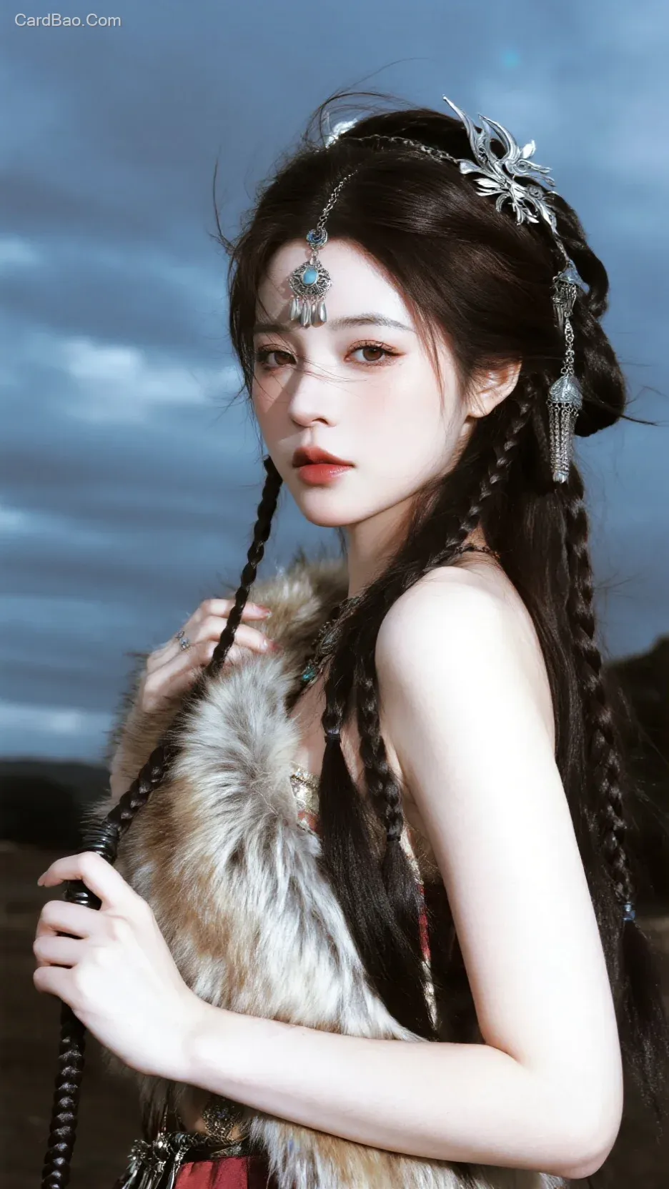 山海经巫山神女,皮草,复古装饰,银饰,金属额饰,碎发随风摆动,复古发饰,超长流苏,很多细碎辫子 油画风 唯美朦胧美 手拿皮鞭