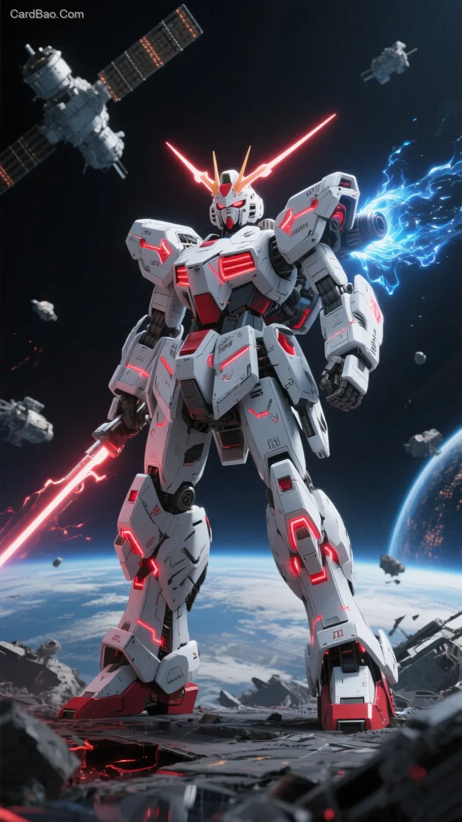 杰作,最佳品质,独角兽高达(RX-0 Unicorn Gundam)全身处于毁灭模式,白色装甲展开露出闪耀的红色精神感应框架覆盖机体全身,头部独角分裂为V字形,光束军刀激活,背部推进器喷射蓝色粒子流,背景为漂浮太空殖民卫星残骸与地球弧光,霓虹反射光效笼罩机体,高细节机械纹理,动画电影级光影质感,高达UC原作风格,超详细,复杂细节,战锤哥特风格,暗黑机械美学,工业级细节,电影级照明,8K分辨率。