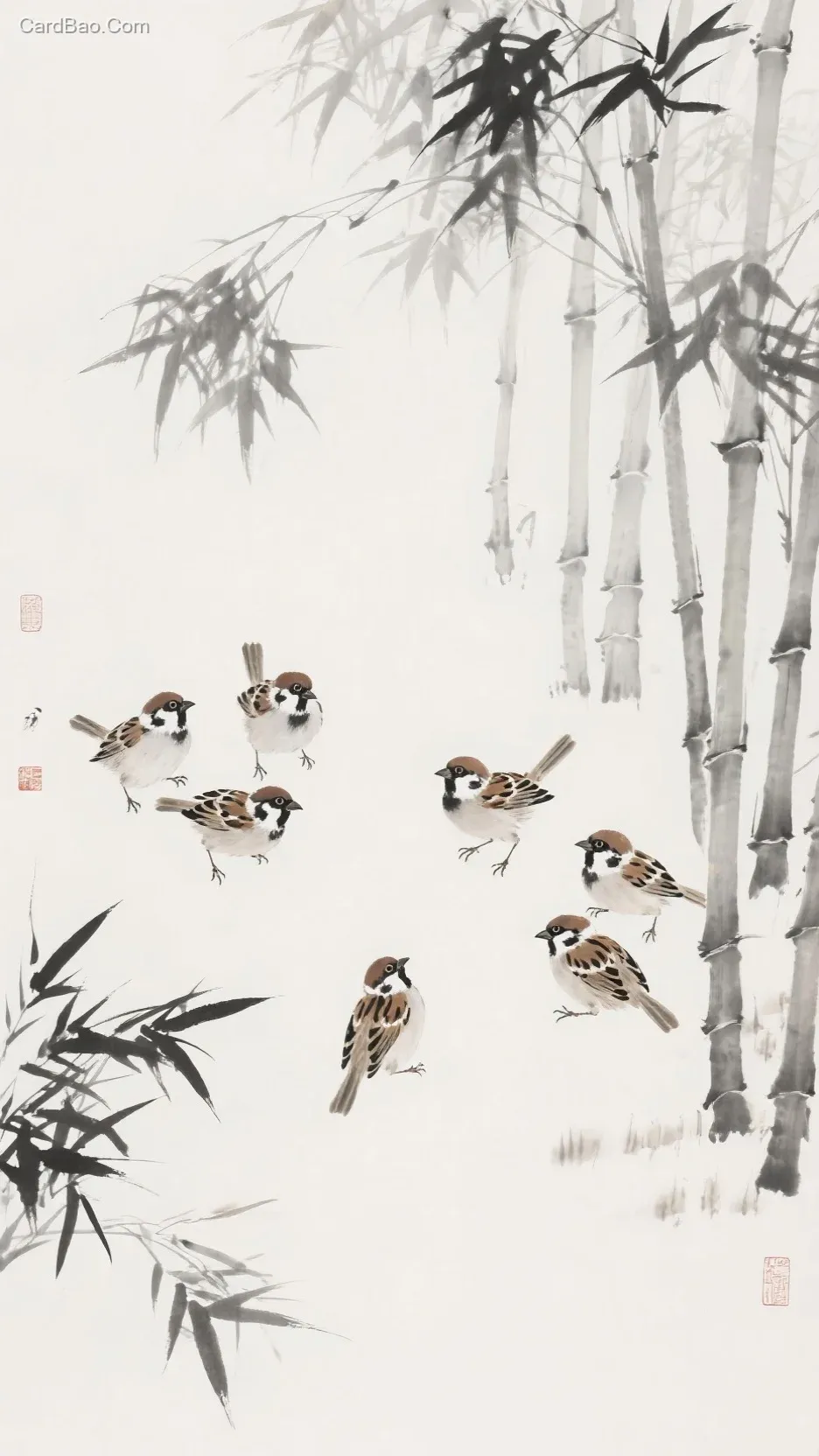 Chinese painting. "Bamboo and Sparrows". A group of sparrows frolicking. Minimalist.