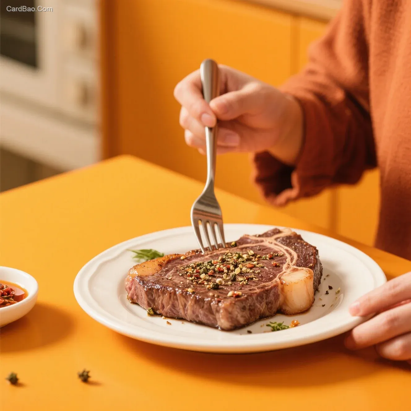 在家享受西冷牛排,橙黄色背景