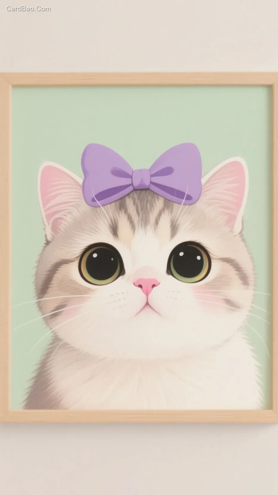 可爱的小猫,大眼睛很亮,粉鼻,装饰画,风格清新软萌,治愈,头上有紫色蝴蝶结