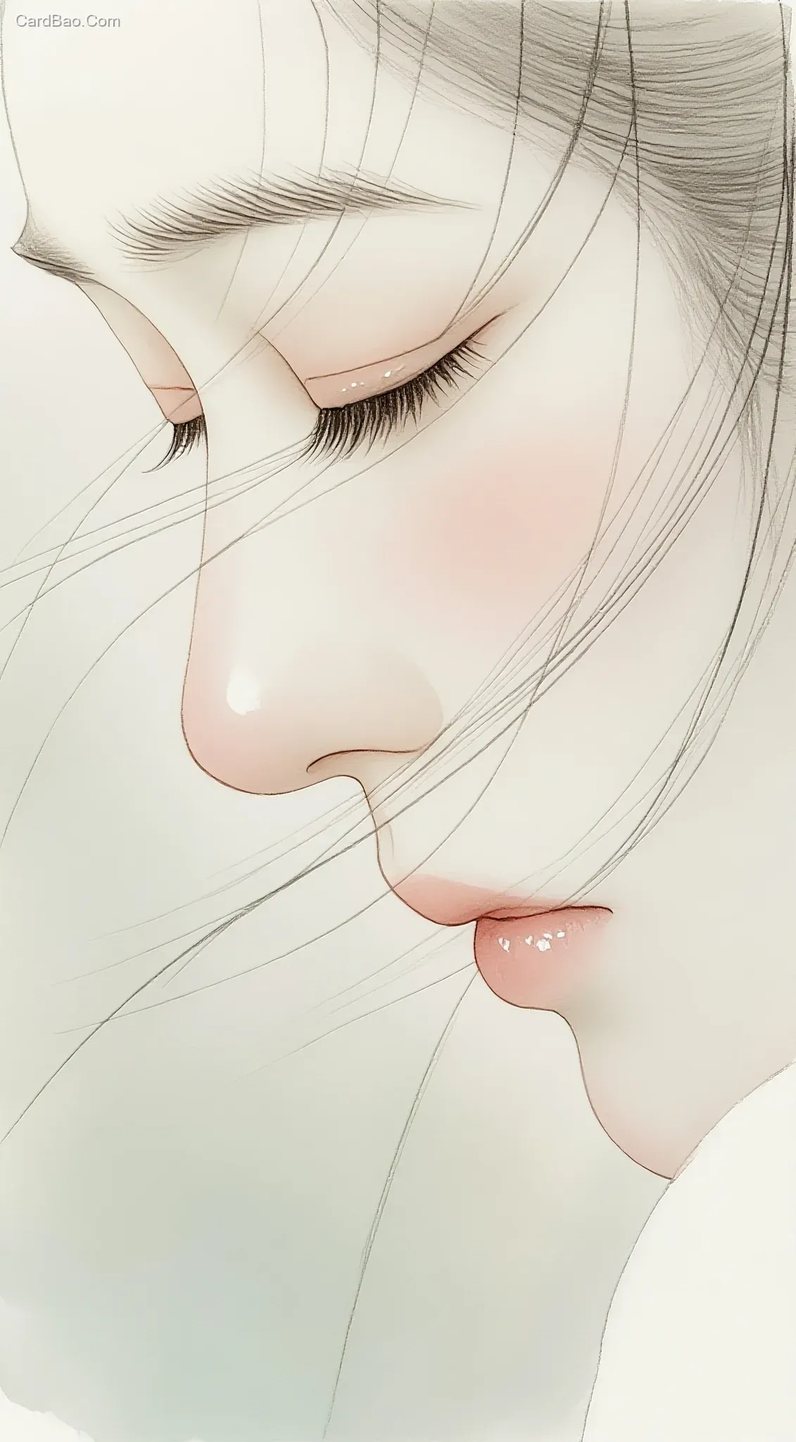 ##画面呈现一幅细腻的人物肖像插画,展现的是一位闭着双眼的女性侧面,发丝轻盈散落,眉眼、唇形等刻画精致,皮肤质感柔和,整体风格清新淡雅,营造出静谧、温婉的氛围,画面清晰真实