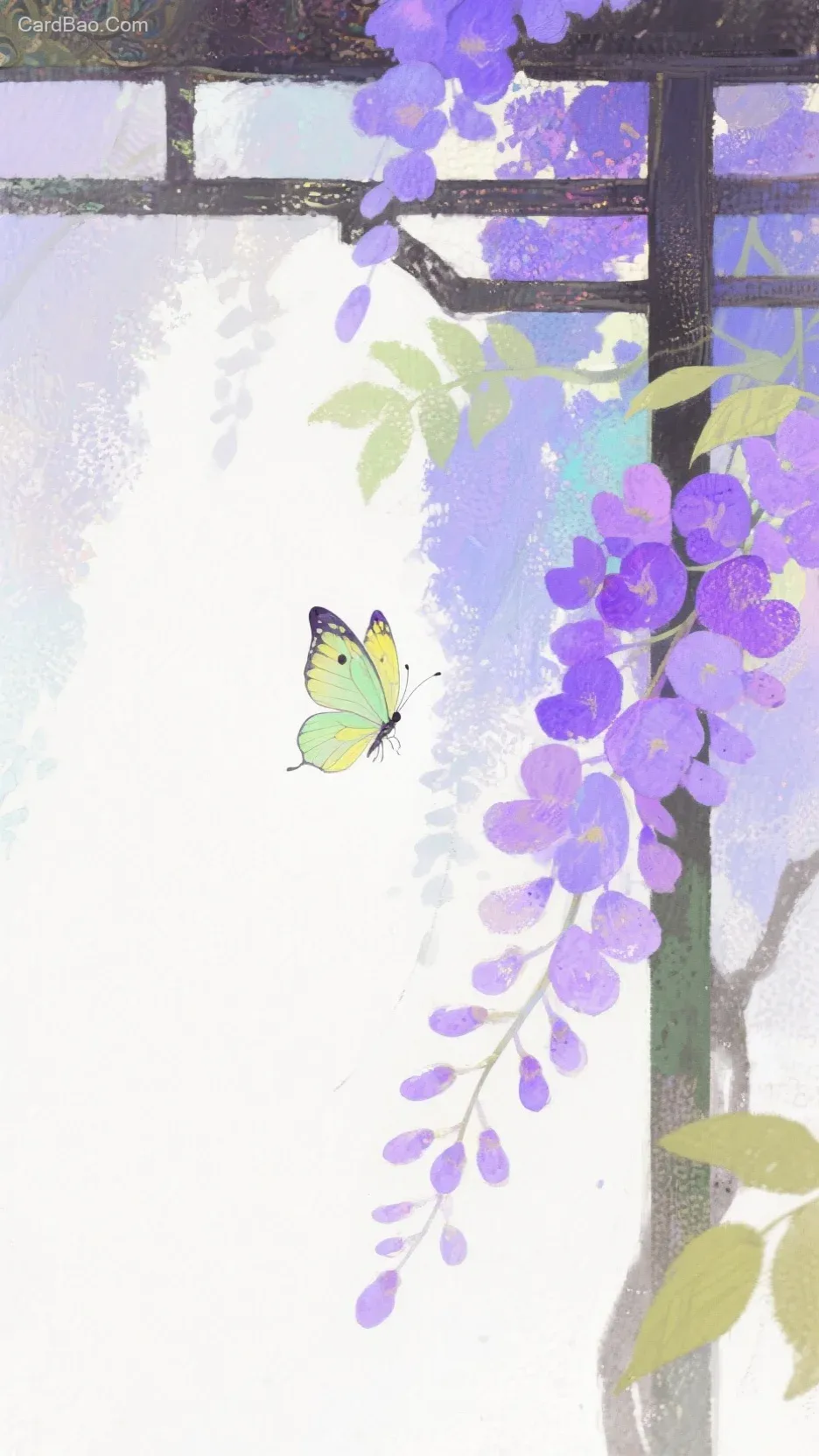 紫藤架,小蝴蝶,淡黄紫色淡绿色,高贵冷艳,意识流,朦胧,迷幻,孤独世界,大面积留白,弥散渐变,画面碎片颜色,层次感,水粉,深度和梦幻效果,明显的磨砂颗粒质感,厚重的大色块笔触,颜色鲜明,明暗对比,光晕,晕染,弥散渐变,高级感,优雅,浪漫主义,水粉艺术插画,梦幻,故事感,设计感,画面拼贴颜色,敦煌画风
