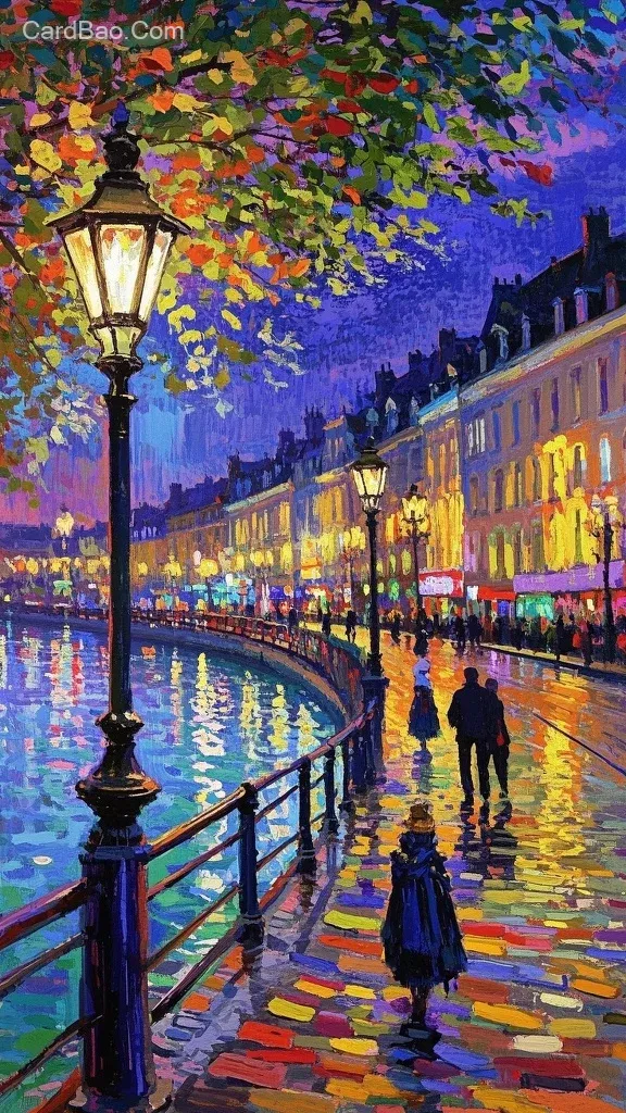 柳州夜景,街头,路灯,迷离,色块堆叠,莫奈风格,印象派,高级感