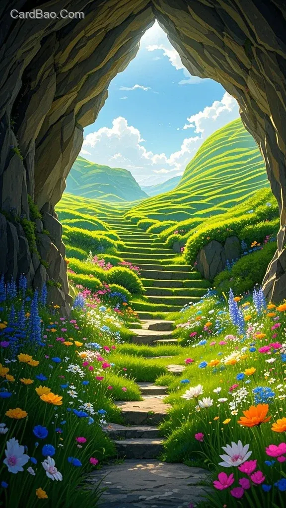 写实风格,全景画面。画面展现洞穴出口外的景象,洞口外是一片繁茂草地,布满色彩缤纷的野花,有黄色、蓝色、白色、粉色、橙色等。草地中间有一条小径,通向远处层层叠叠的绿色台阶。台阶两侧山坡覆盖绿植,上方是蓝天白云,阳光明媚,整体氛围清新美好。