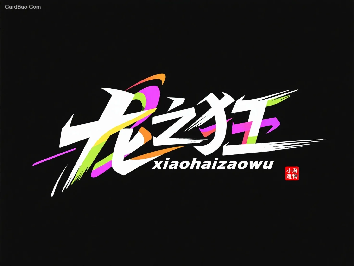 字体设计 “龙之狂” ,搭配英文 “xiaohaizaowu”进行排版,创意字体设计,线条流畅且富有动感,笔画粗细不一,将字体进行抽象变形,创造独特的节奏和动感,整体风格活泼、时尚、具有现代感和艺术感,视觉冲击力强 。右下方有个极小的正方形红色文印“小海造物”。纯黑色干净背景,白色字,