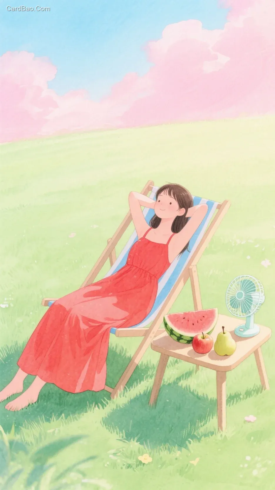 插畫,水彩風格插畫,夏天來了,一個漂亮的女孩,穿着红色长裙躺在躺椅上,旁边還有一個小桌子,小桌子上有西瓜、苹果、梨和小風扇,整個畫面治愈唯美。