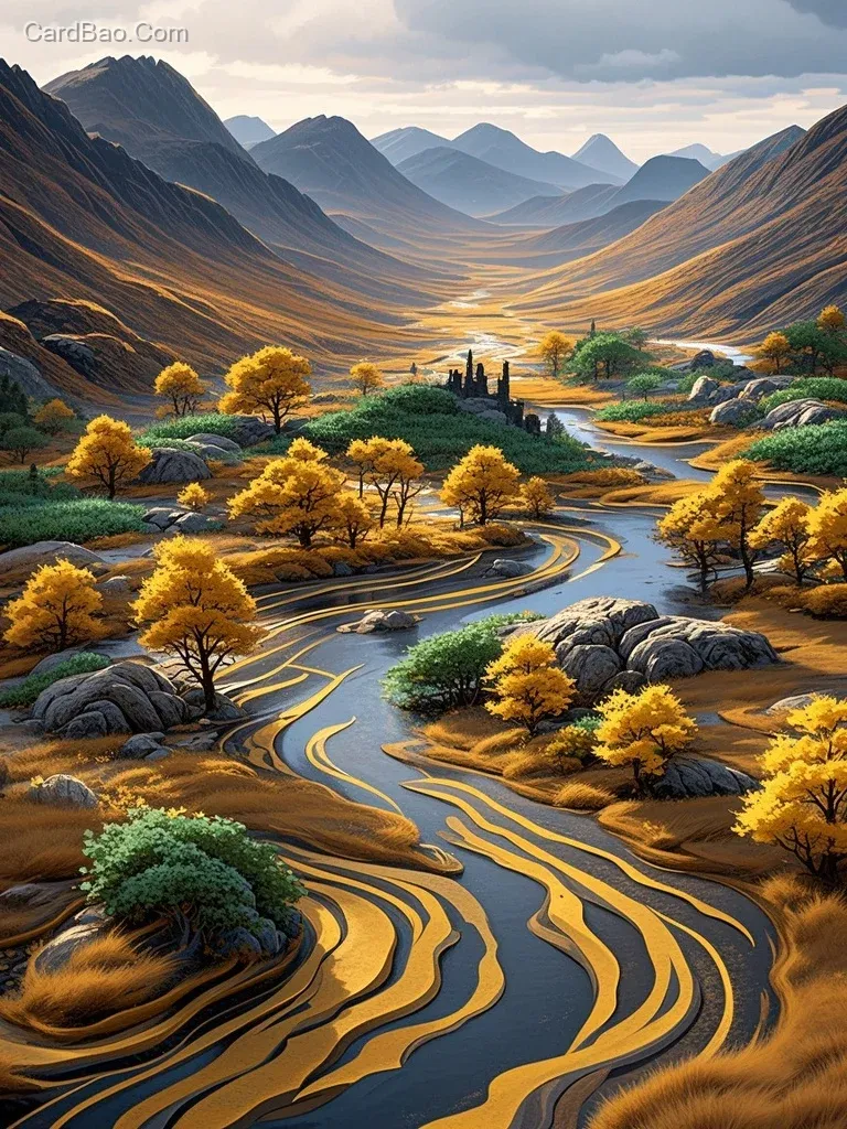 - **Overall Composition & Atmosphere**: Utilize OC rendering to create a vast yet slightly mysterious autumn ambiance, employing particle impressionist techniques and scattered sand lines to depict the unique autumn scenery of the Scottish Highlands. The overall color palette leans toward cool golden yellows, dark browns, and gray-blues, capturing the desolate beauty of the highland autumn.