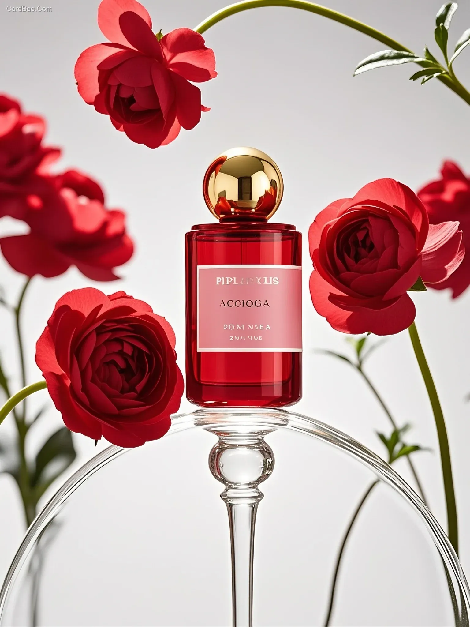 A fresh and elegant perfume promotional image featuring a red bottle with a golden spherical cap, a pink label displaying product information, placed on a transparent glass pedestal, surrounded by red flowers. The style is minimalist and sophisticated, with a white background, soft lighting, and a balanced composition that focuses on the product.