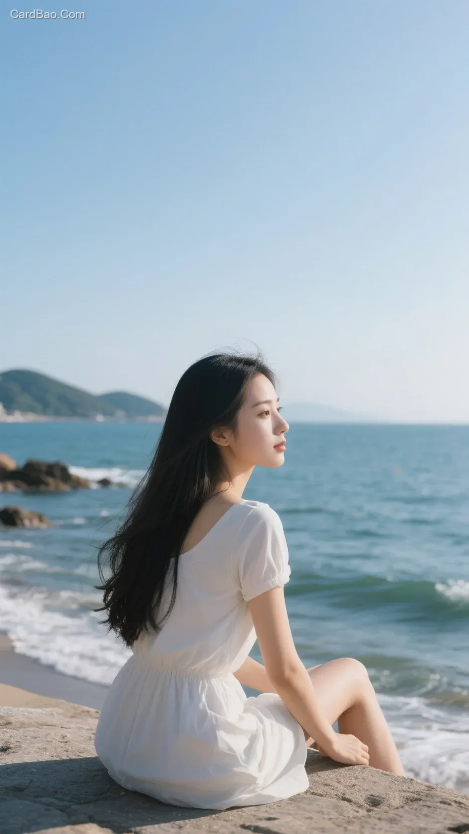 A beautiful woman with long hair sitting by the seaside in Shenzhen, looking at the scenery in profile.