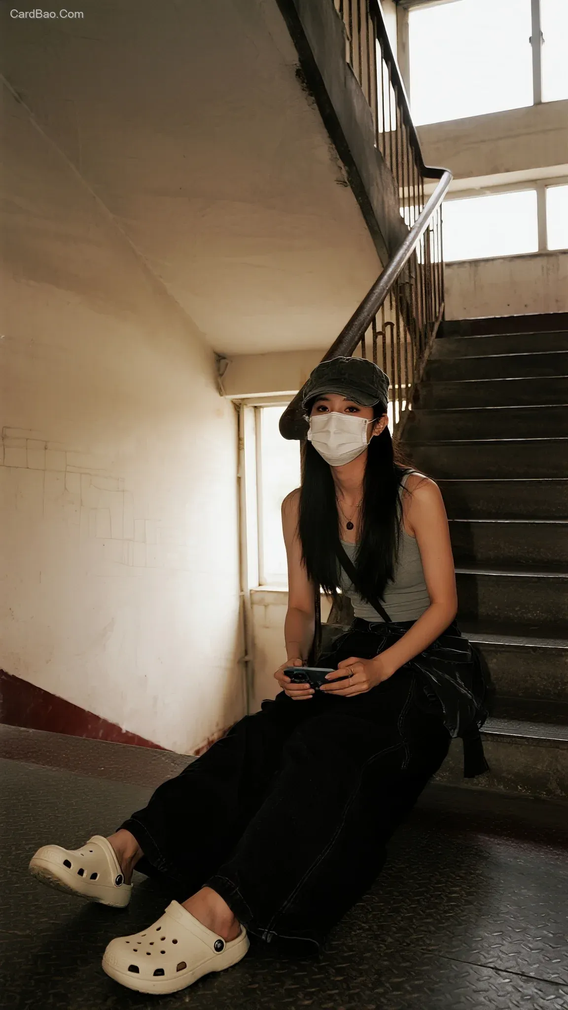 一位真实风格的长发美女,穿着背心和黑色阔腿裤,穿着洞洞鞋,戴着帽子和口罩,双腿自然伸直贴紧地面,在宿舍楼底下,玩着手机没在看镜头,超强胶片颗粒感,复古色调,电影质感,故事感,层次感,细节丰富生动完美,完美光影效果,超高清细节,高噪点