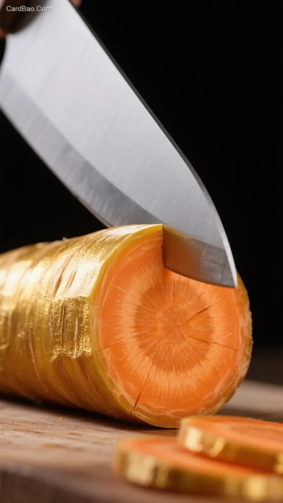 一把锋利的菜刀正在慢慢地切一个黄金材质组成的胡萝卜,要清晰展示胡萝卜切面纹理细节