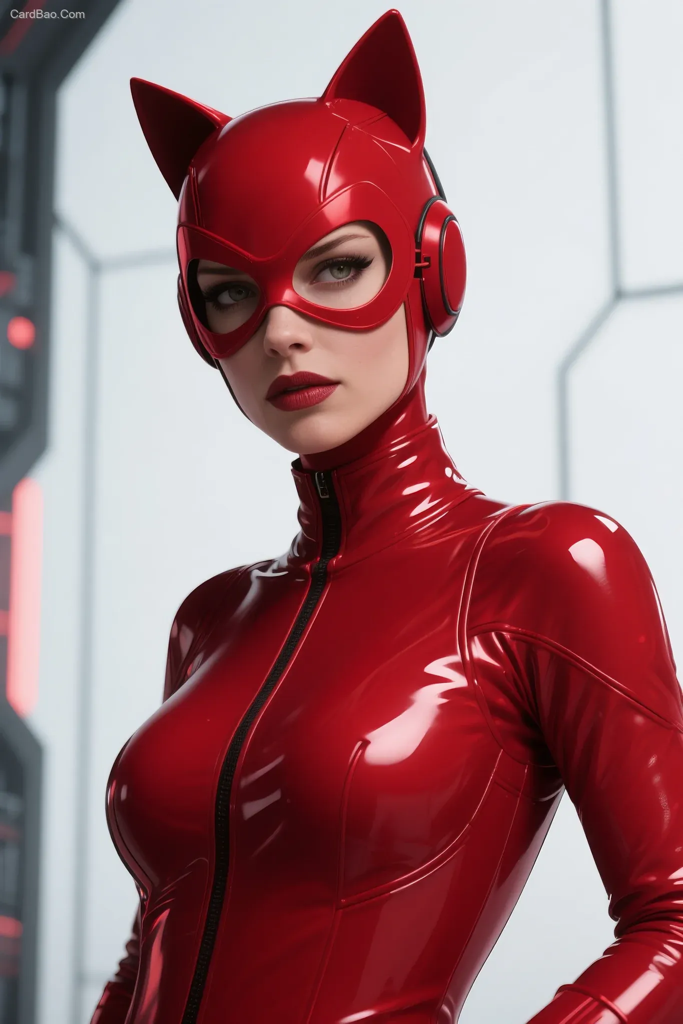 国际科幻大片插画,极简主义,电影《猫女》Catwoman主角菲柏丝,纯红猫耳罩眼罩,红色性感紧身胶衣战斗服,电影剧情场景,电影级高清特效画面,3D高精度建模渲染,高品质细节,超精细CG,超高清分辨率,C4D,32K壁纸,