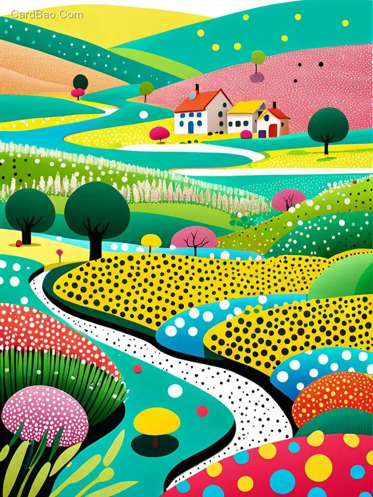 Liuhua风格,山水插画,波点艺术,治愈系风景,春色,五彩斑斓,当代艺术。草间弥生风格,山水插画,波点艺术,治愈系风景,春色,五彩斑斓,当代艺术。