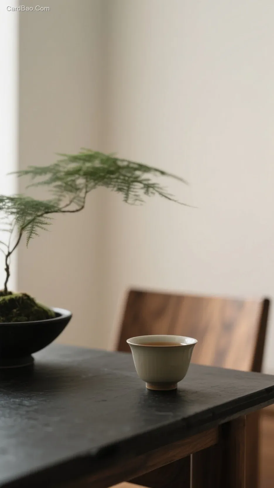画面呈现简约室内场景,近景是放在深色台面的茶杯,背景浅景深,浅色墙面搭配木质家具,桌上黑盆绿植枝叶舒展,营造出宁静、雅致的氛围,传递出闲适的生活情调 。