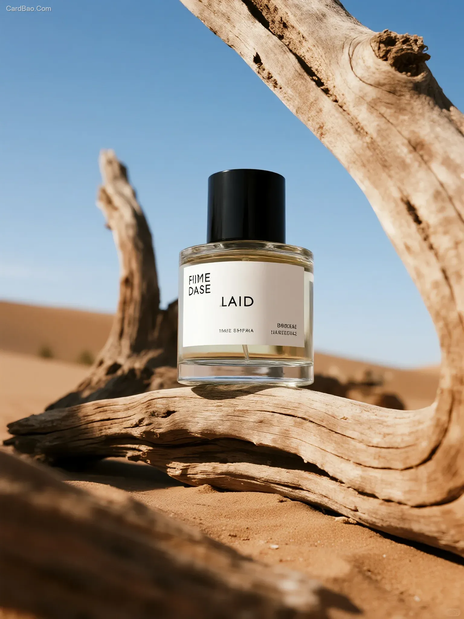 Perfume Photography, Commercial Photography, Square Glass Bottle Perfume, Black Cap, Dead Wood, Desert, Sky, Low-Angle Shot, Looking Upward, Strong Perspective, High Impact, Magazine Style, Premium Feel, Cinematic Quality, Simulated Real Environment, Imperfections, Fine Details, High Quality, 8K