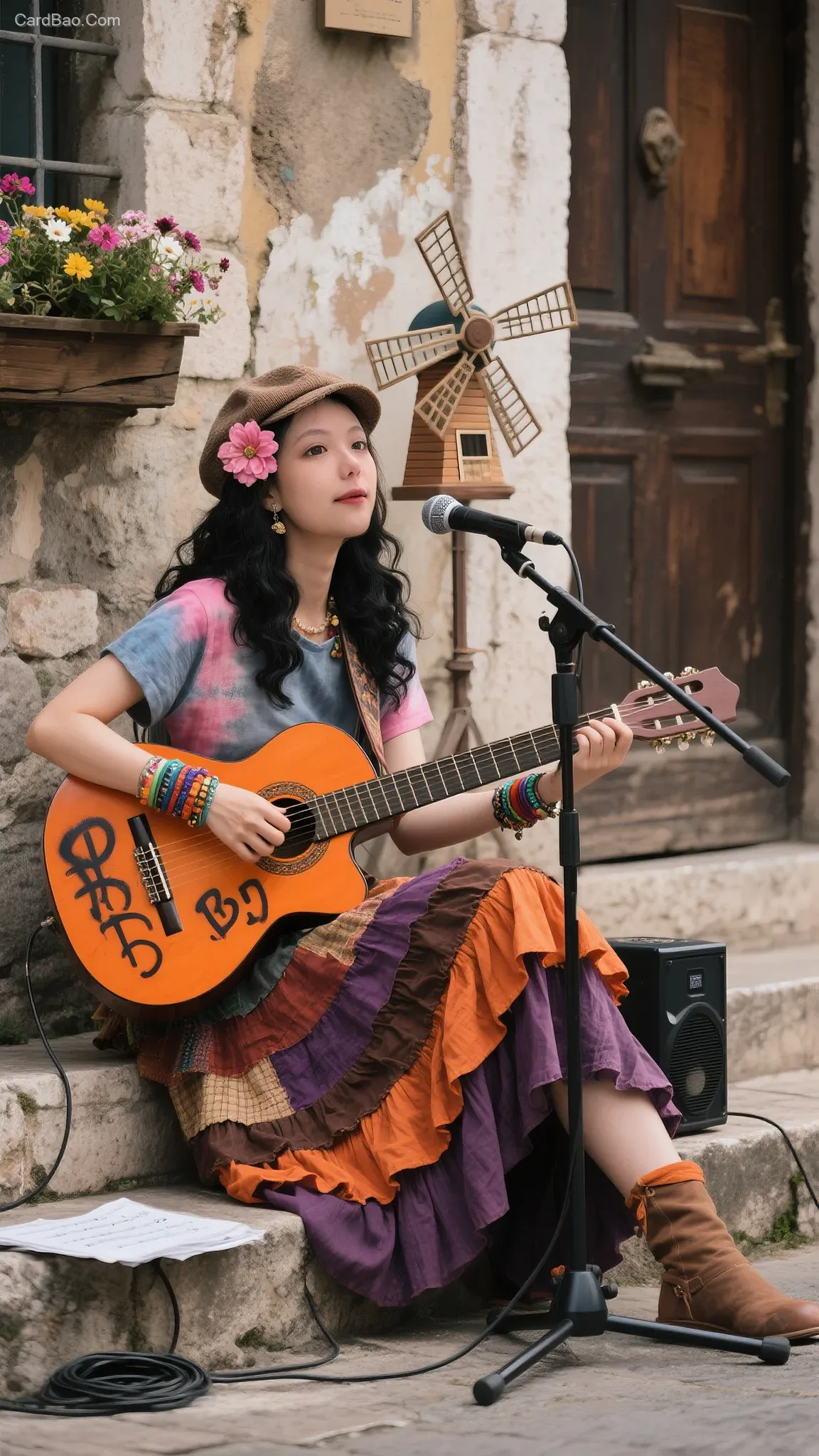 Photography background: Soft, diffused natural light minimizes shadows. The backdrop features an old stone building (with a wooden door and weathered walls) and a small flower stand (displaying flowers and a windmill), evoking the artistic charm of European streets. This setting blends the musician's free-spirited passion with the nostalgic ambiance of the old town.