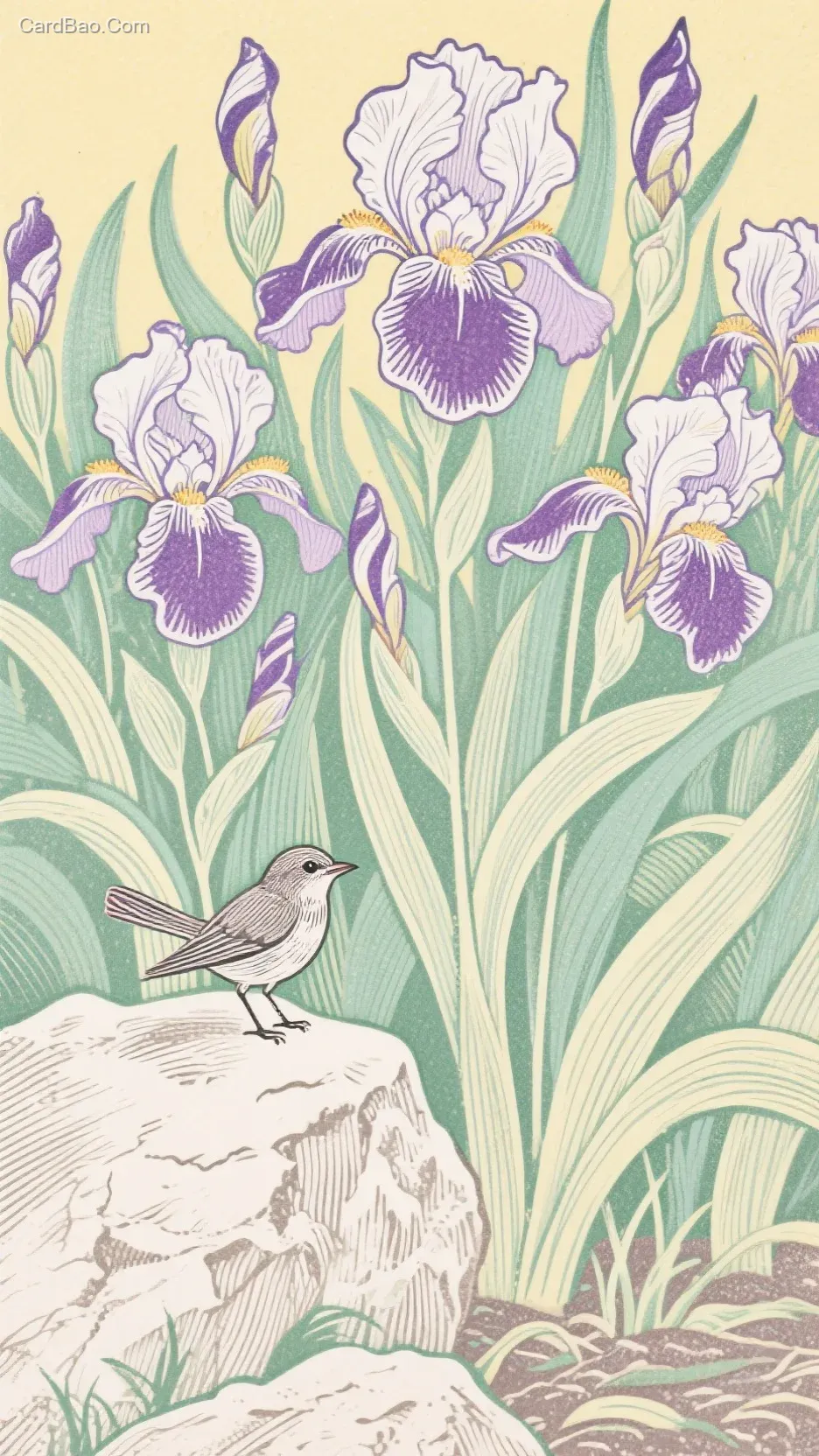 花丛主题彩色海报,版画,巨型鸢尾花特写采用等高线条表示,花丛中有小鸟用线条表示,景石用等高线条,突出自然纹理线条