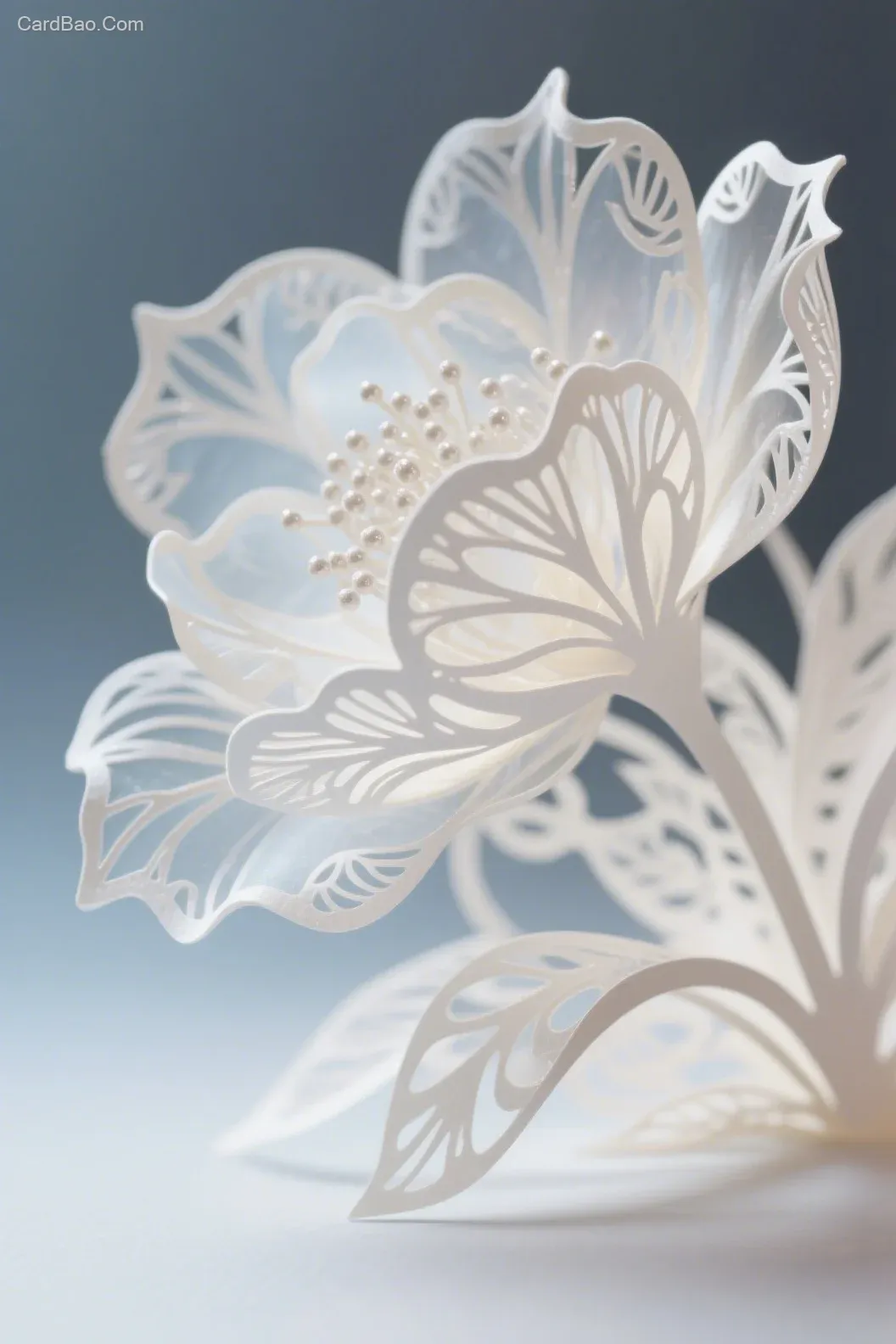 Exquisite paper-cut flowers, intricately carved from semi-translucent pearlescent paper, featuring graceful curved designs, incredibly refined with details as fine as a hair's breadth.