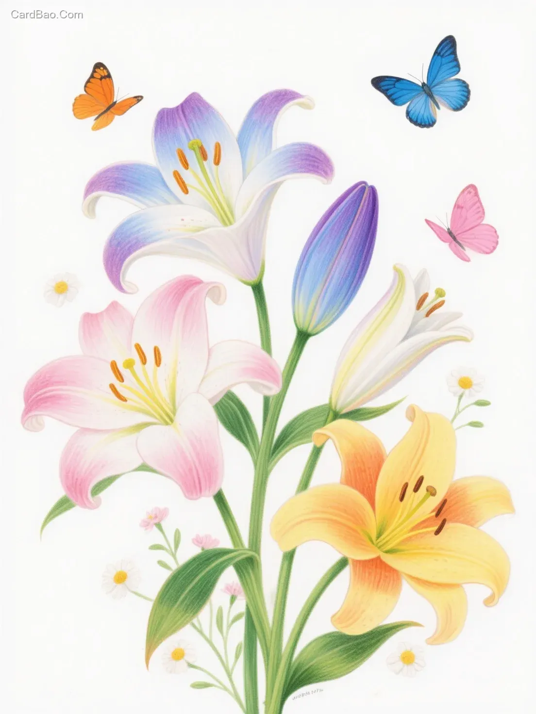 写实彩铅插画风格,铅笔笔刷效果,画面主体是几朵百合花,花朵有粉白渐色,有蓝紫白渐色,有黄白渐色,有橙黄渐色,有绿黄渐色等色彩,花蕊为黄色,花茎和叶片是绿色,还有一朵蓝紫花苞,含苞待放。周围点缀着一些的小花。背景白色,营造出精致的质感。画面中有几只蝴蝶,颜色包括橙色、粉色和蓝色,色彩鲜艳,高饱和度,增添了灵动的氛围。整体氛围清新美好,充满生机