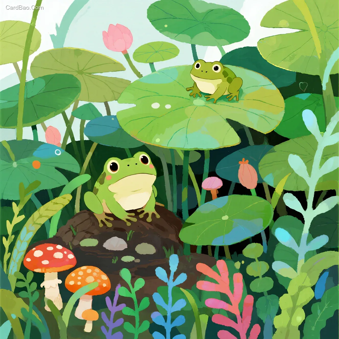 This is a fresh and adorable illustration depicting a natural scene with elements such as frogs, mushrooms, lotus leaves, and green plants. A frog hides beneath a lotus leaf, while mushrooms and various colorful plants are scattered throughout, exuding a playful charm. The lines are clean and smooth, the colors are bright with rich layers, and the forms are cute, resembling the artistic style found in children's picture books or natural science illustrations. The composition adopts a flat perspective, thoughtfully arranging elements like frogs and plants to highlight the whimsical appeal of a small natural setting.