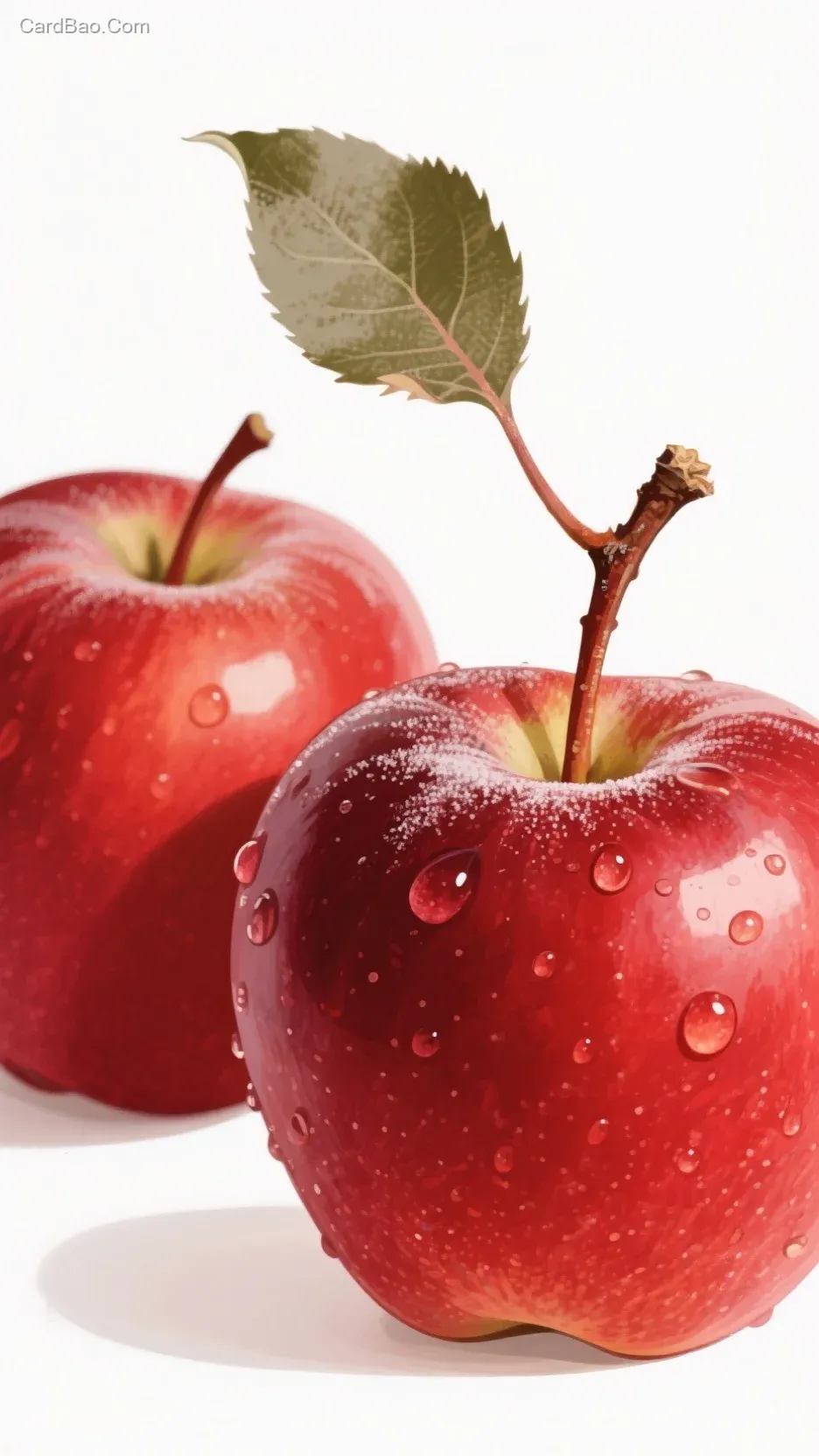 两三个娇艳欲滴的高原苹果,刚刚摘下,带梗和一两片叶子,苹果带几滴水珠,产品级摄影,插画级别手绘感。深邃的红,熟透,带诱人的果霜,食欲感,白色背景。