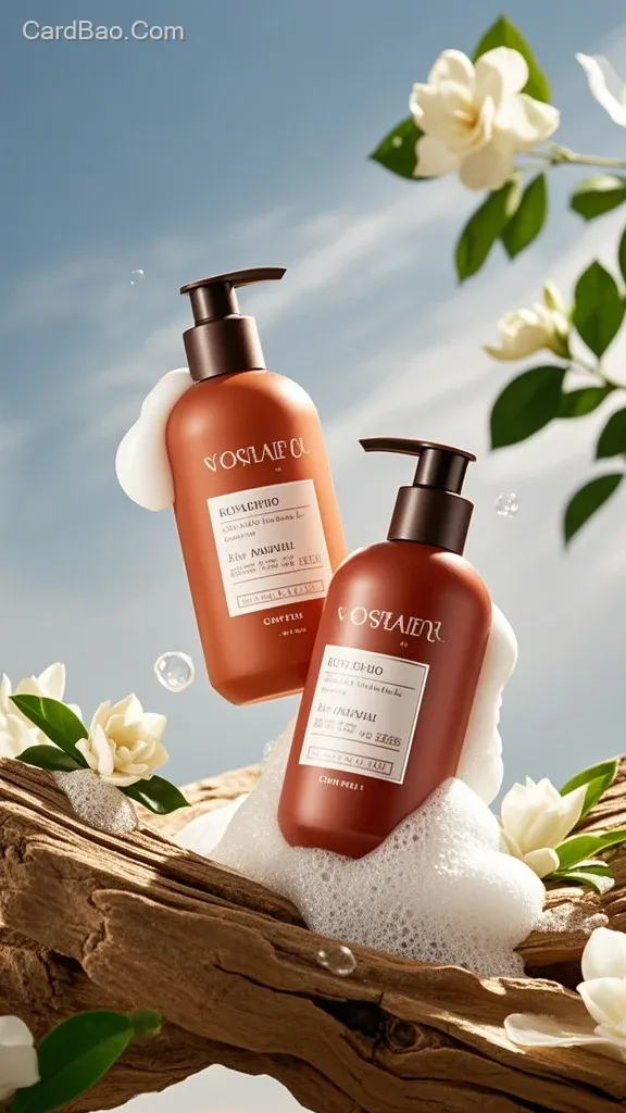Hyper-realistic photography featuring Kangxue Gardenia Body Lotion, showcasing two beige pump-bottle packaging, with one bottle floating mid-air. Highlight the brand name ("Kangxue"), "Gardenia Body Lotion," and "patented ingredients" on the label. Arrange alongside fresh gardenia ingredients, placed on a wooden surface with foam accents. Set against a sky backdrop adorned with gardenia blossoms, emphasizing the bottle's smooth texture and clear label text (red-brown color scheme). Convey a natural, nurturing ambiance that highlights the herbal skincare benefits, creating an elegant product image of the body lotion.
