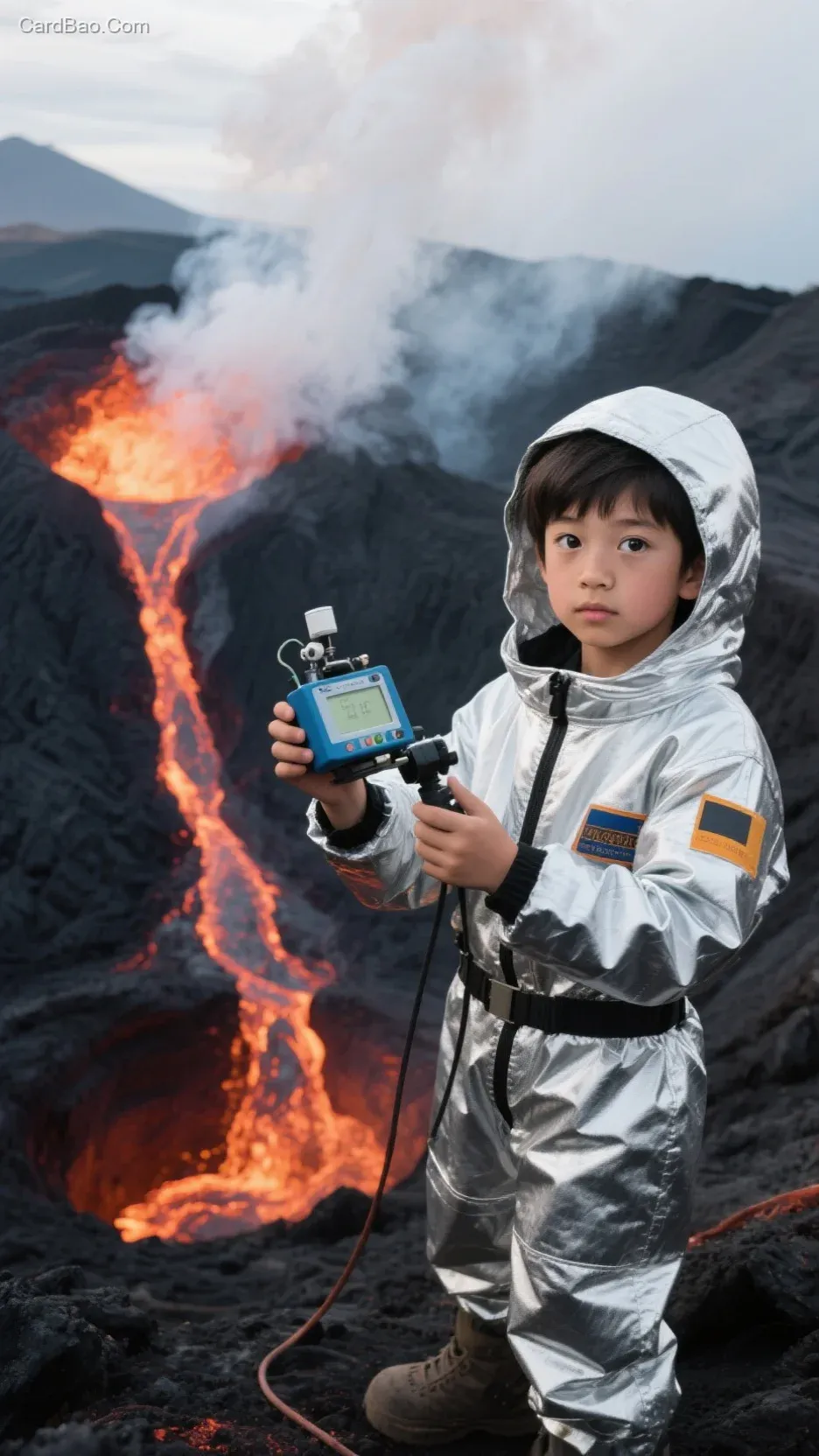 14岁少年,长睫毛大眼睛双眼皮,五官精致美丽。穿着隔热防护服,手里拿着科学仪器,在火山口,对着火山口内测量。火山口内的深处,烟尘滚滚岩浆缓慢的喷涌。真实风格